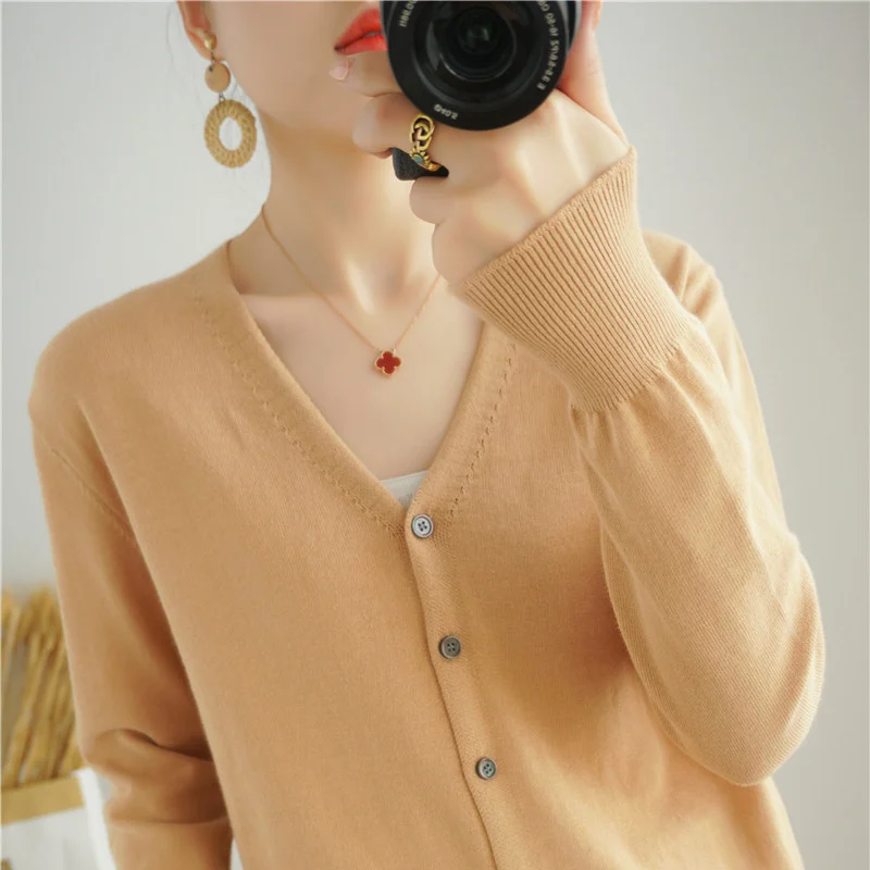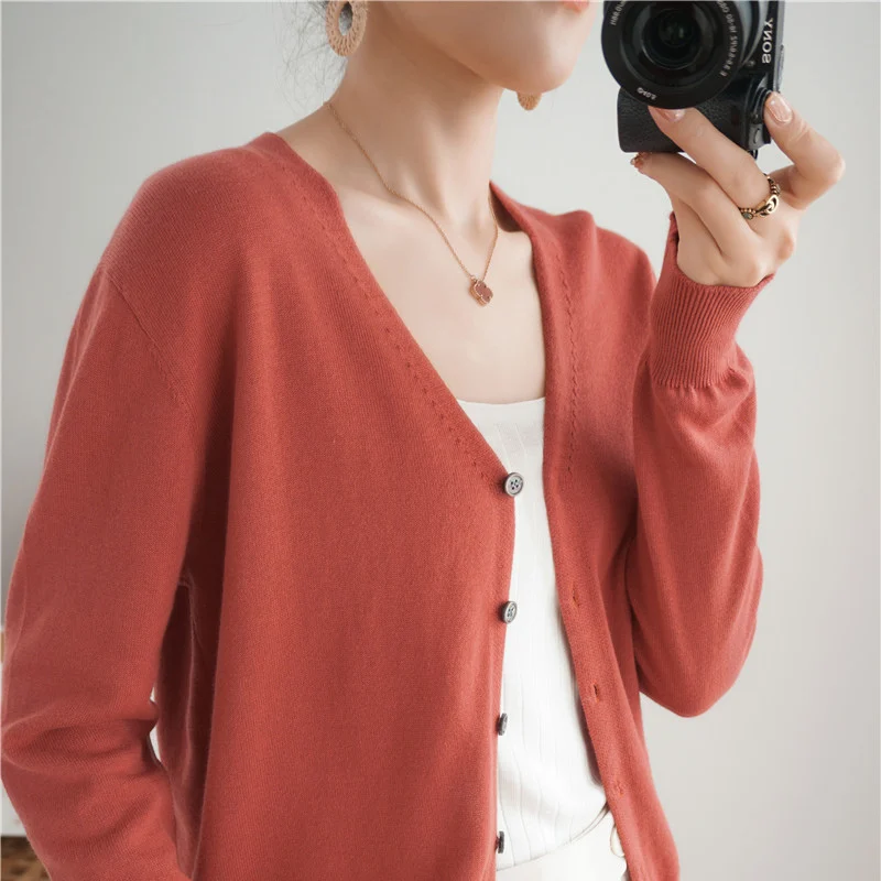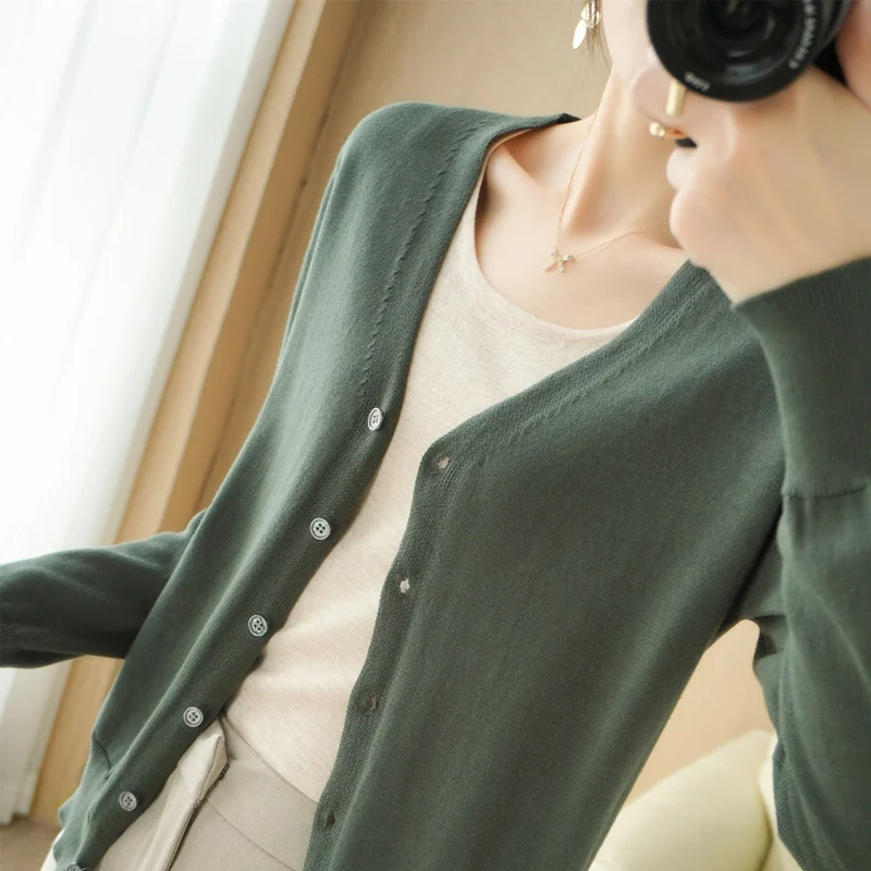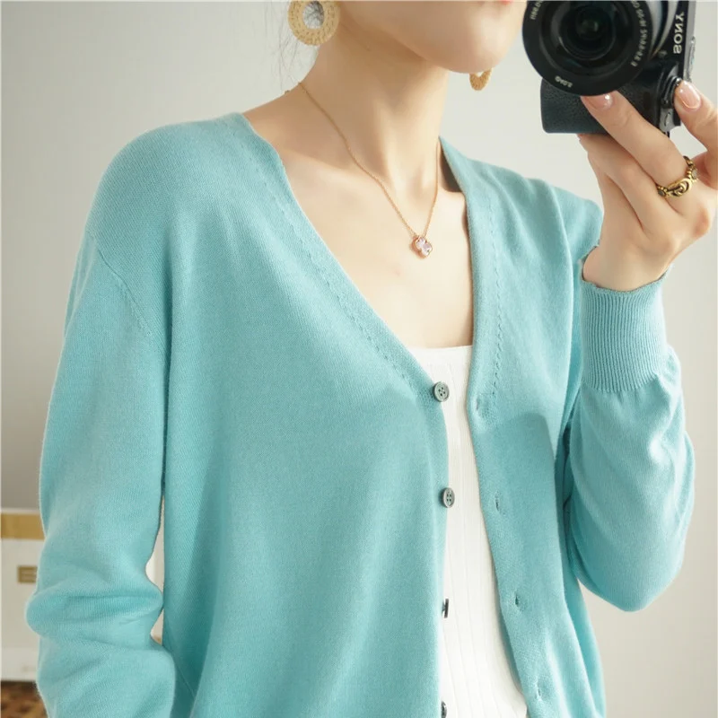 100% Cotton Line Long Sleeve V-Neck Knitted Cardigan Women Loose Short Solid Color Simple Sun Protection SMY K61