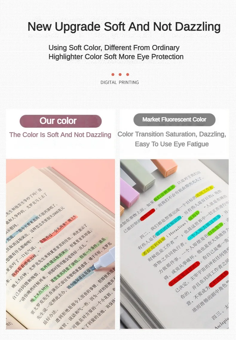 Discover the world of color and comfort with our eye-friendly soft-tone colored highlighter!