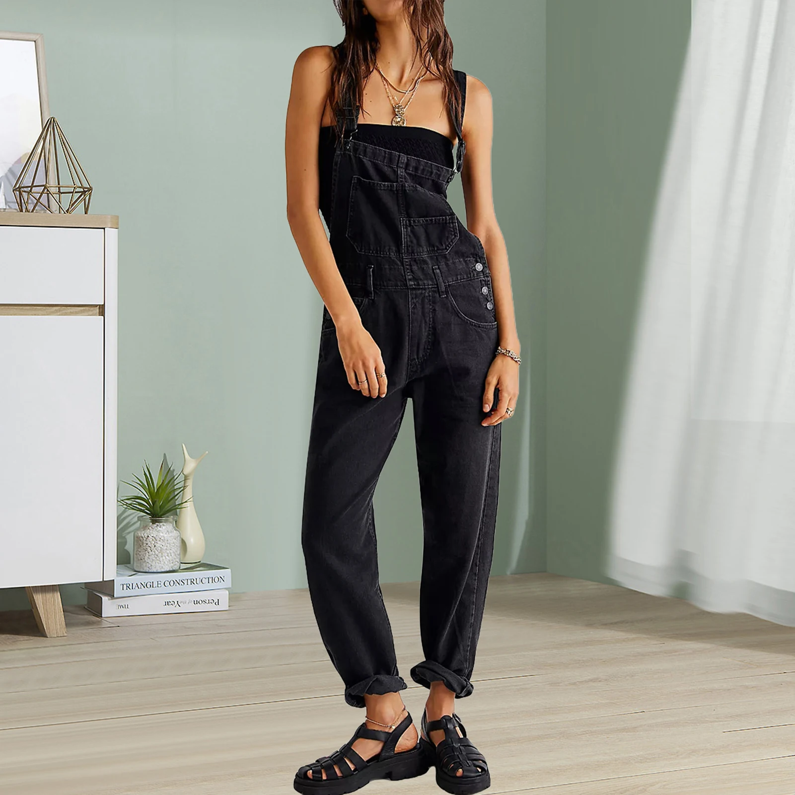 2023 Summer Black Jumpsuit Women Loose Dungarees Overalls Wide Leg Women Long Jumpsuit Ladies Overalls For Women