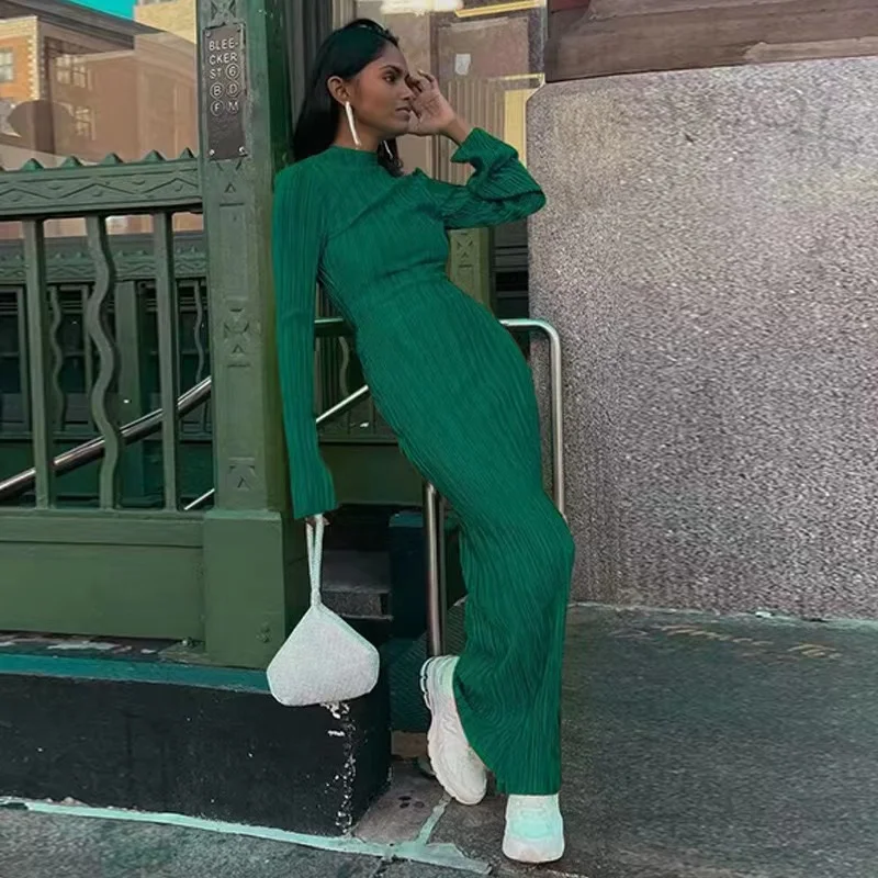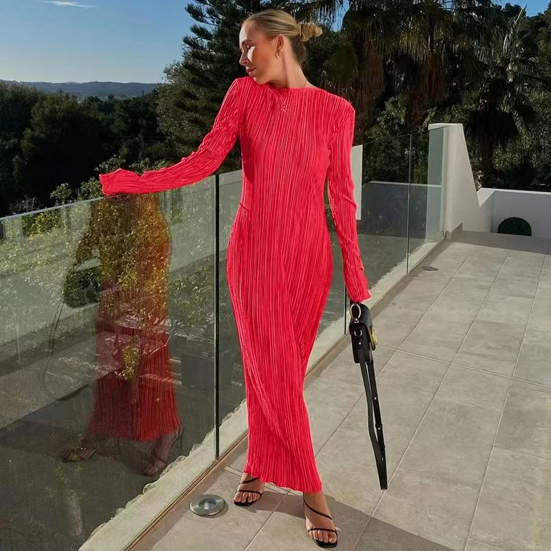 2024 Spring Elegant Bodycon Dress Women Sexy Solid O Neck Flare Sleeves Long Summer Dresses Holiday Vestidos Black Red Orange