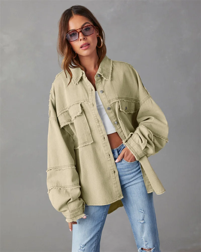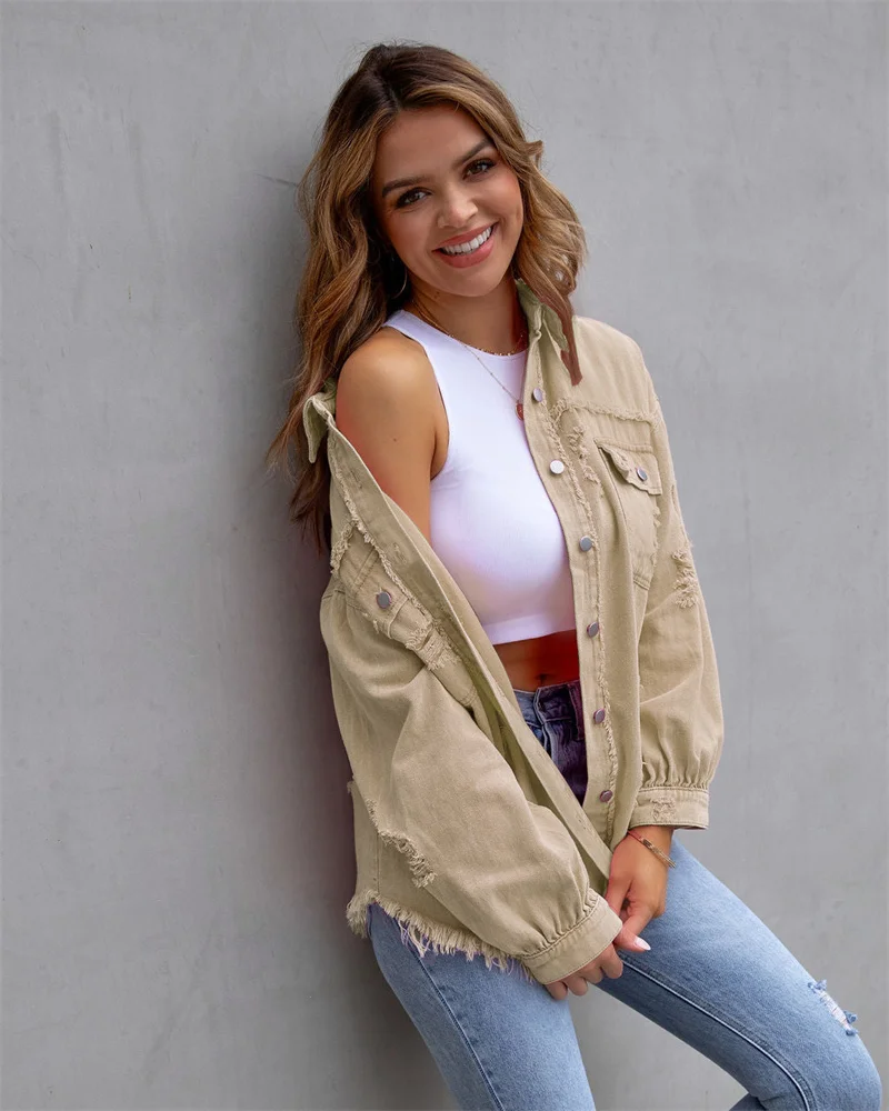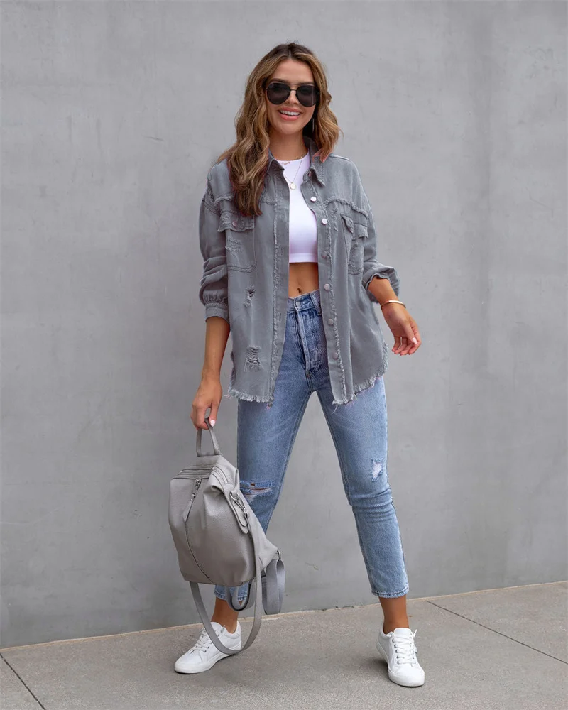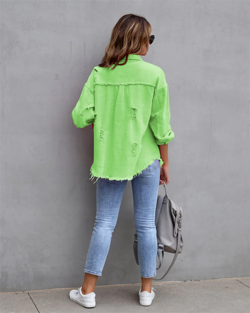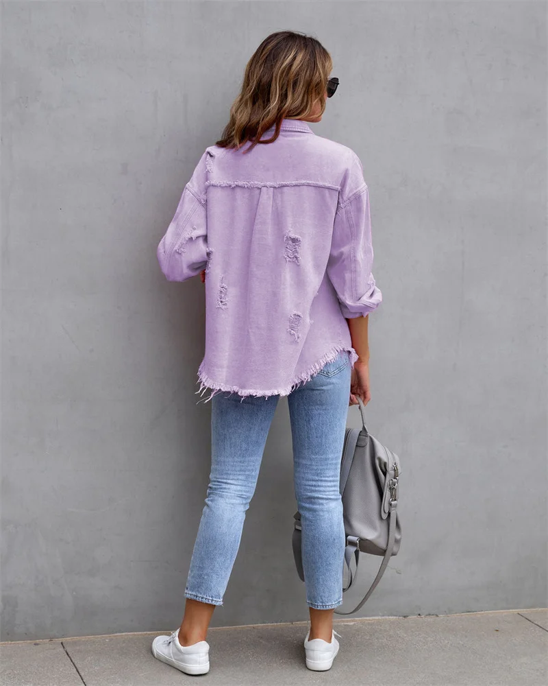 2025 Spring Autumn Shirt Style Denim Jacket Women Holes Raw-edges Jeancoat Casual Tops Female Oversize Loose Outerwear 7 Colors