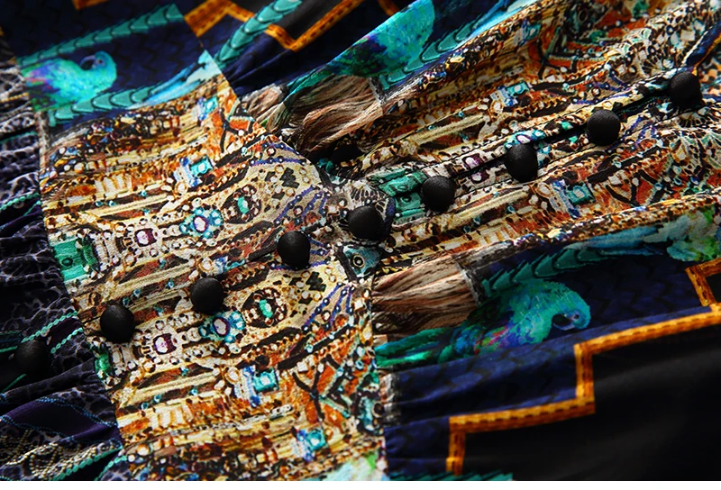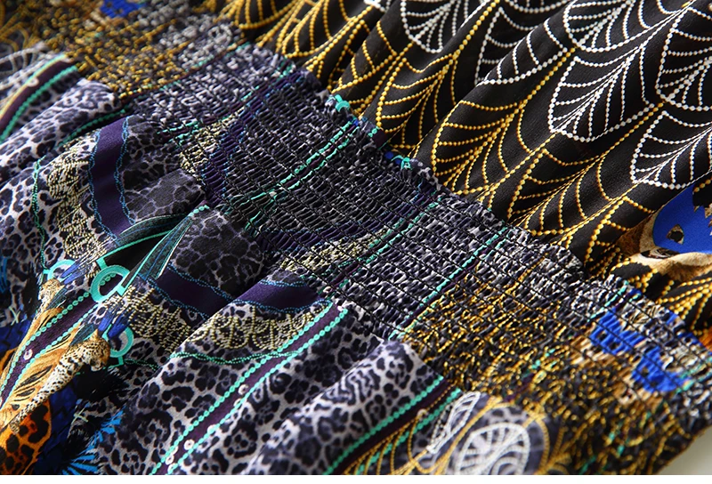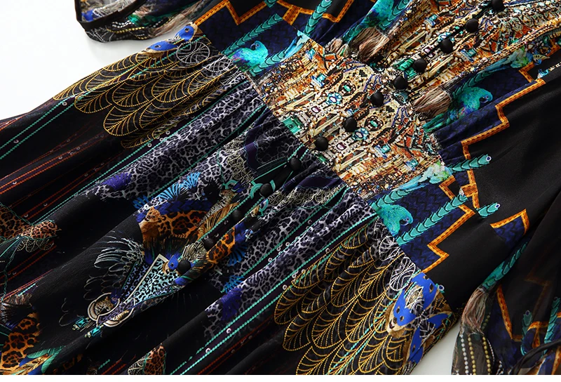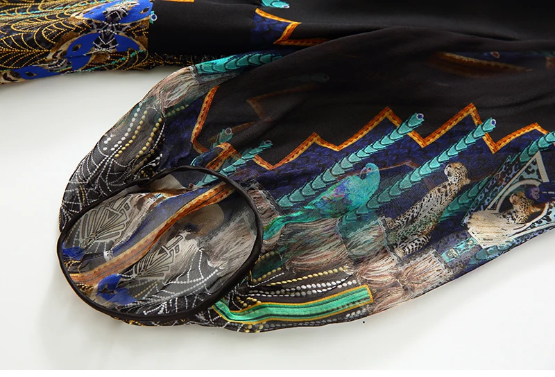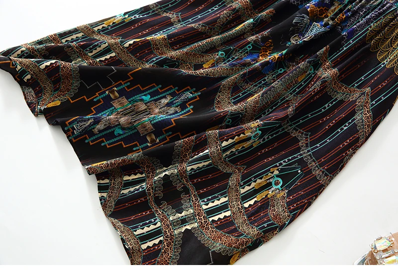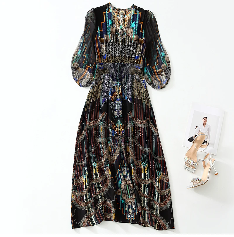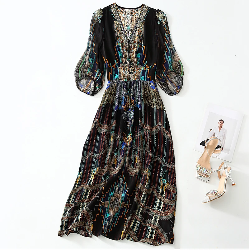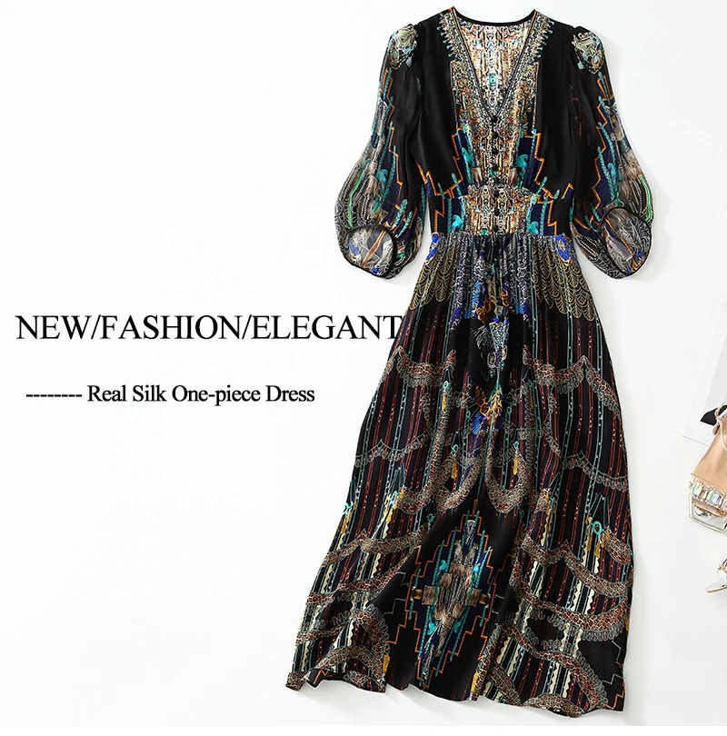 2025 Summer Bohemian Dresses For Women Elegant V-neck High Waist Women's Print Black Dress A-line 100% Real Silk Long Midi Dress