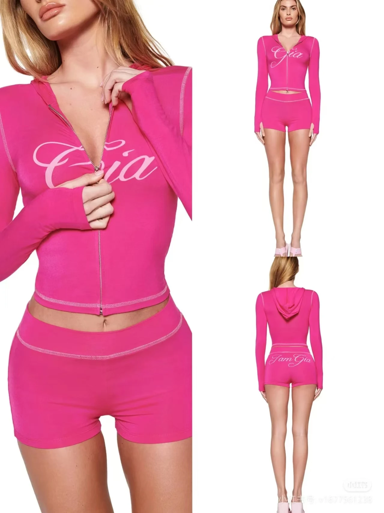 25 Summer New Shoulder Letter Printed Bright Thread Design Slimming Hooded Zipper Short Coat Shorts Set for Women