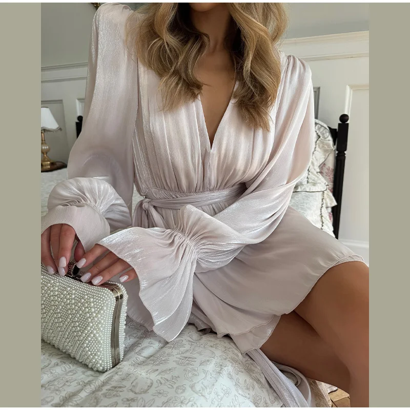 3D Flower Ruffles Mini Dress Women Elegant V Neck Lace Up Long Sleeves Ribbon Vestidos Female 2025 Summer Fashion Chic Dress