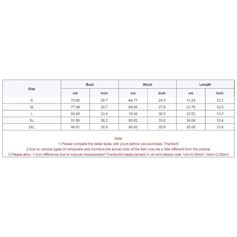 Size:2XL Bust:98.81cm(38.9inch) Waist:90.93cm(35.8inch) Length:35.05cm(13.8inch)
