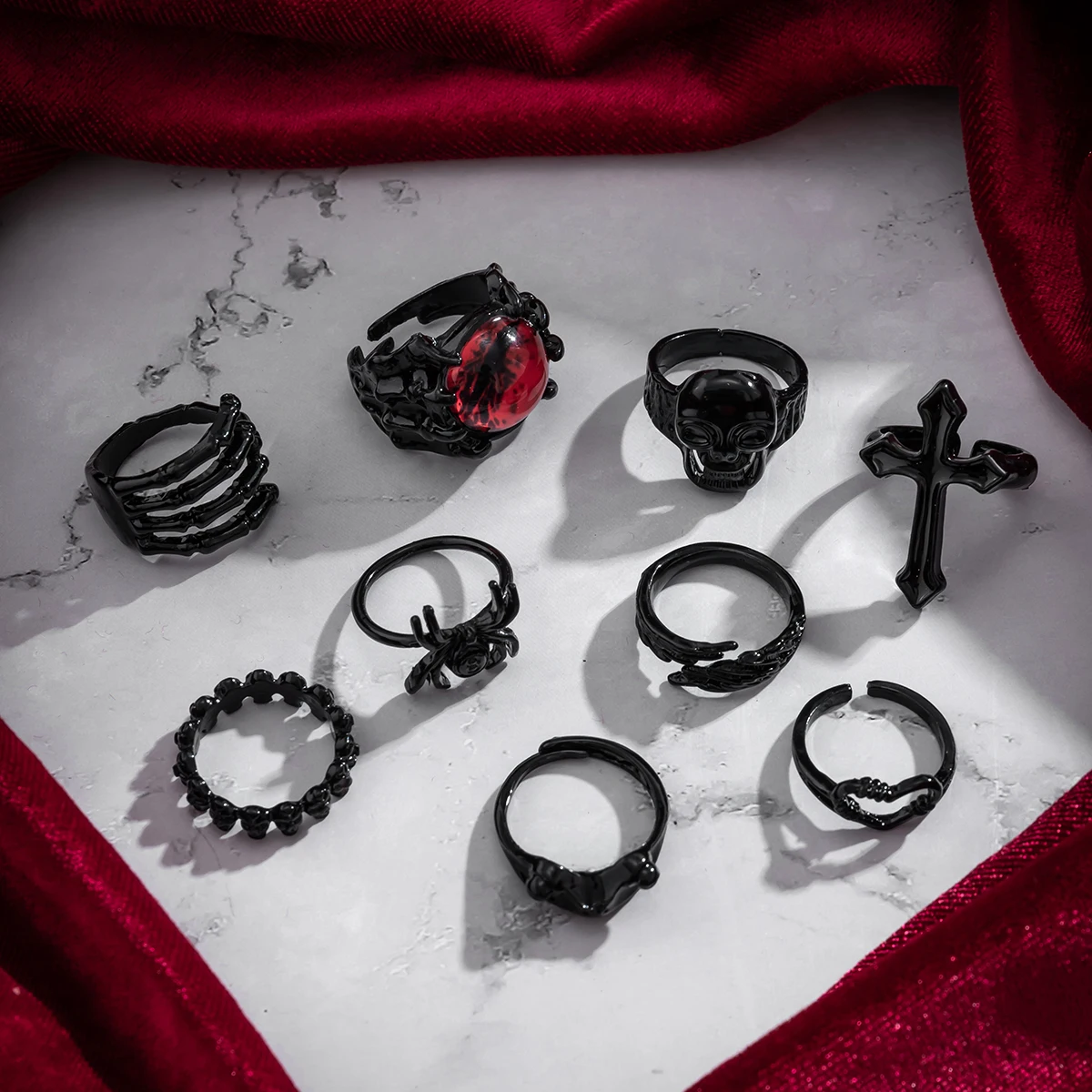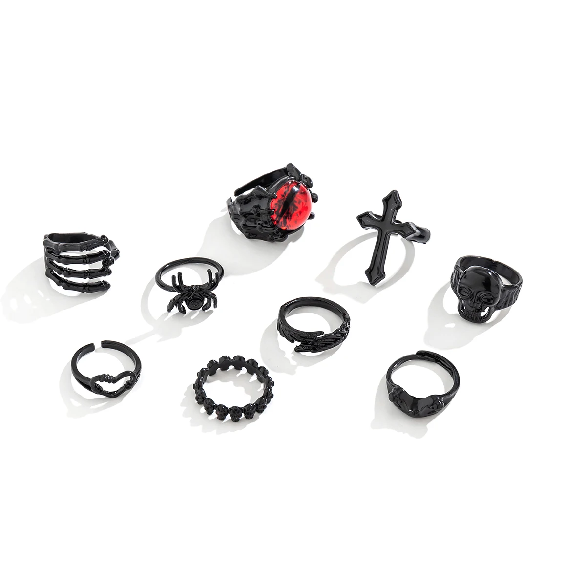9Pcs/Set Goth Black Devil Eye Skull Spider Palm Rings for Women Vintage Cross Jesus Love Heart Rings Halloween Jewelry Gift New