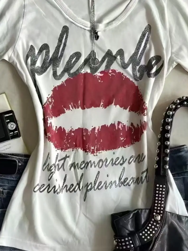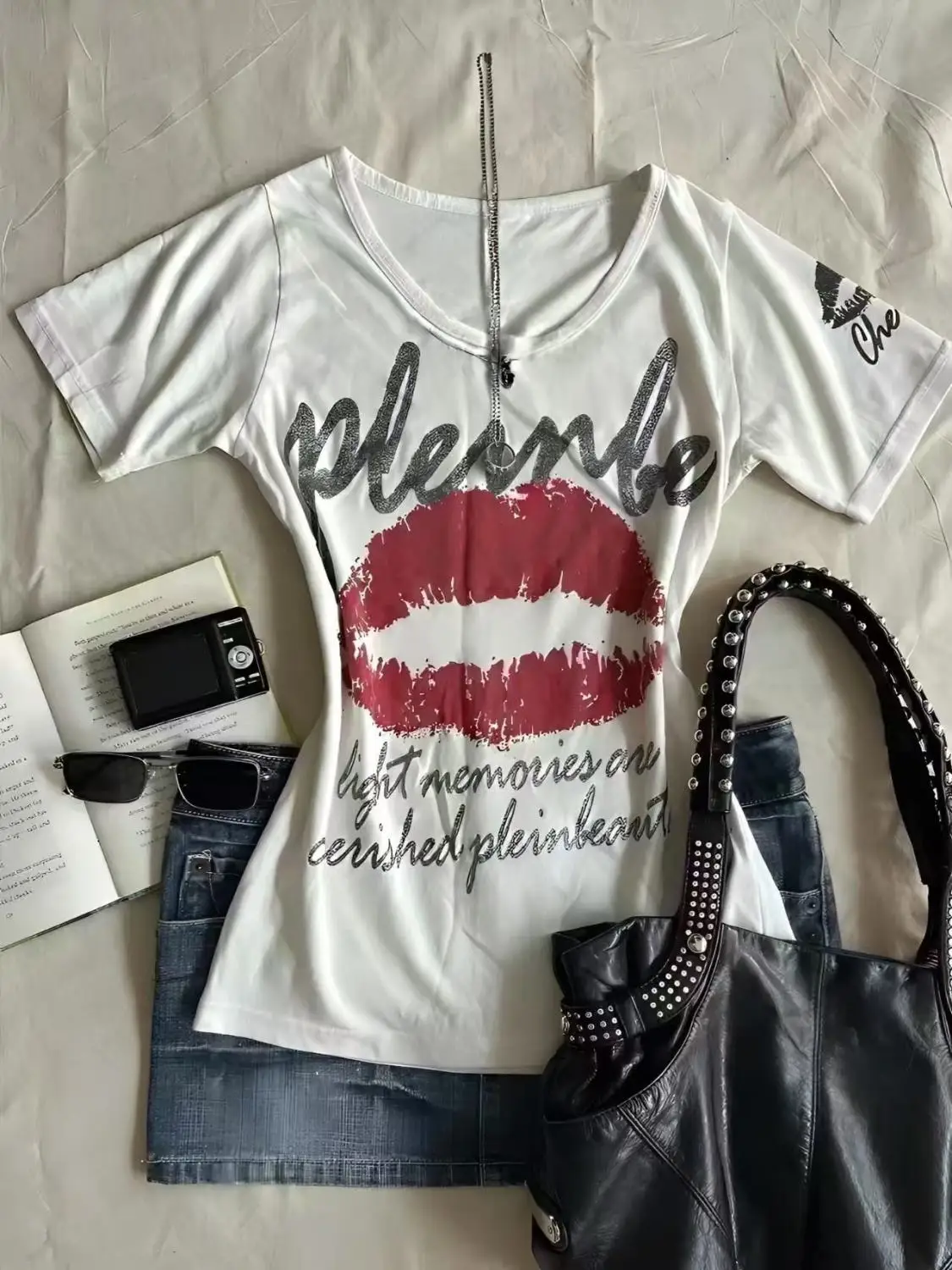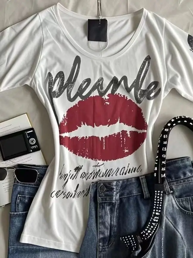American Retro Sweetheart Red Lips Letter Print Slim Short-sleeved T-shirt Women Summer Fashion Street Hot Sexy Casual Top