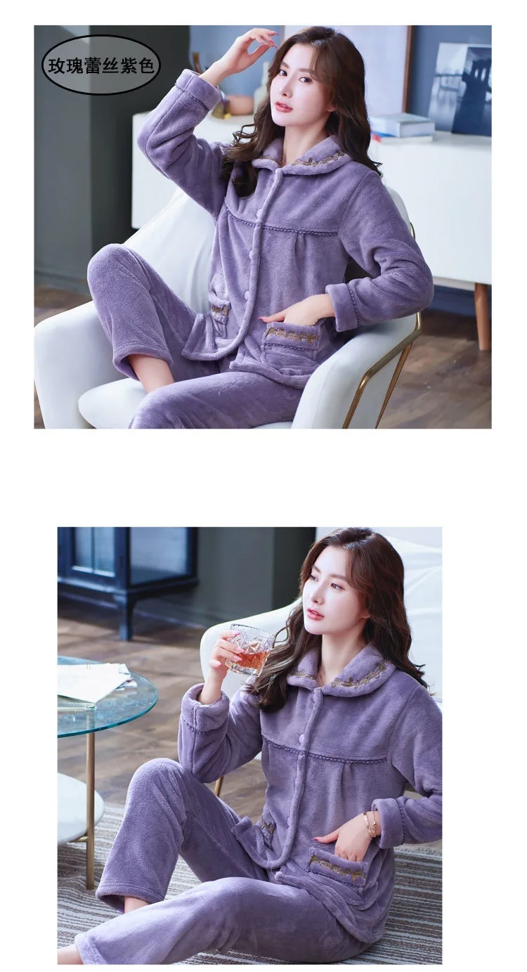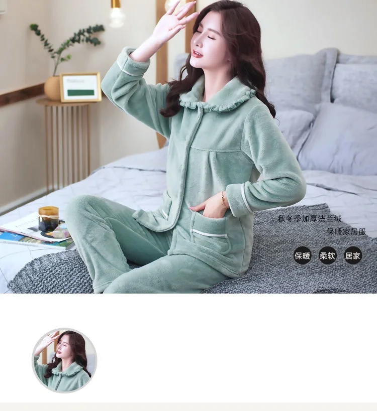 Autumn Winter Thicken Flannel Women Pajamas Set Two-piece suit Warm Loose Long-sleeve Female Casual Home service Single-breasted