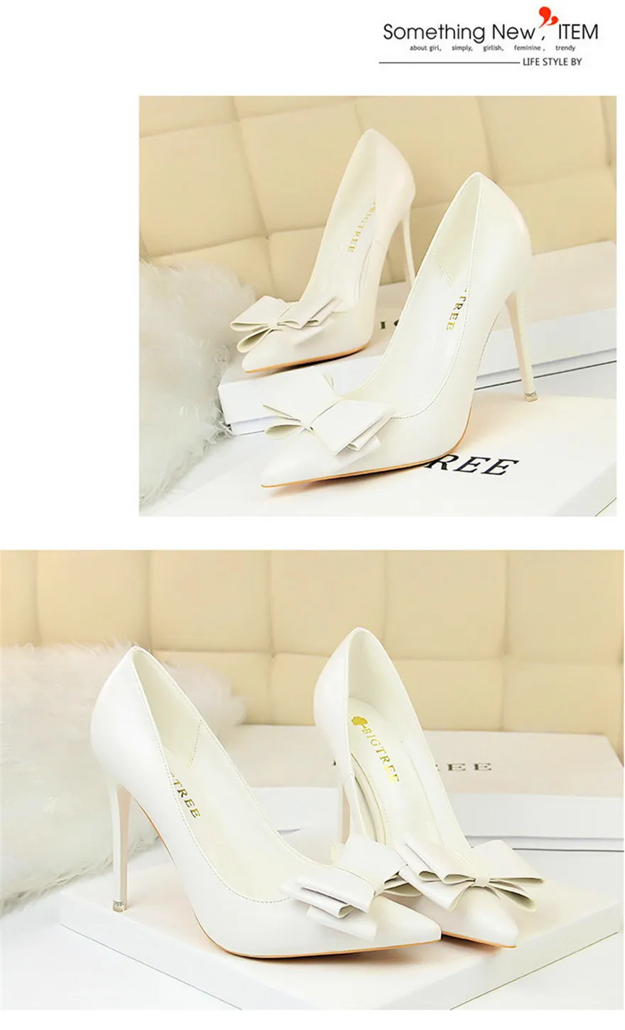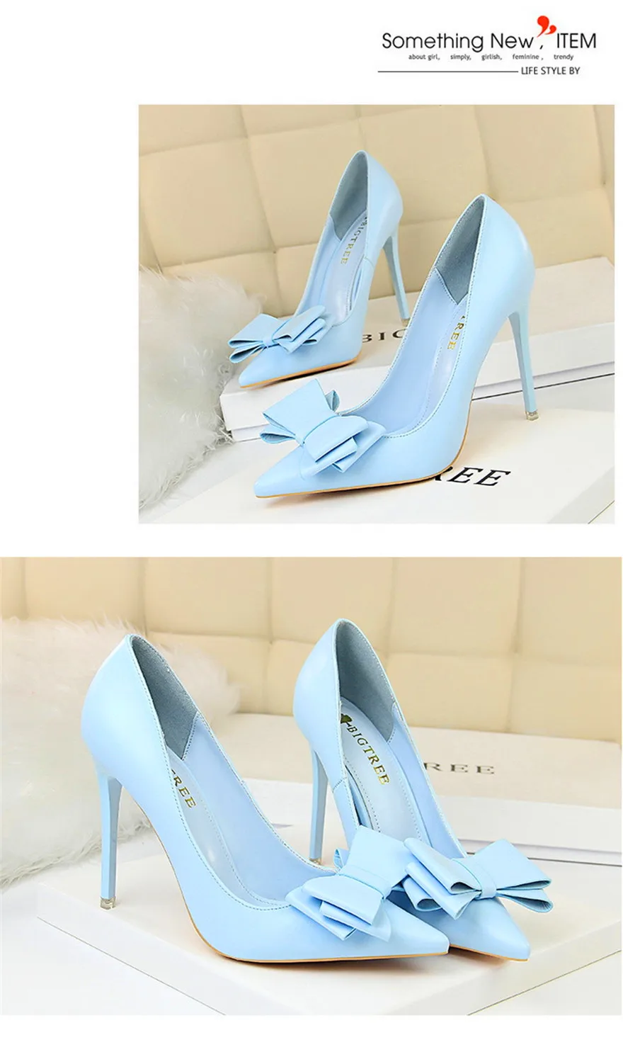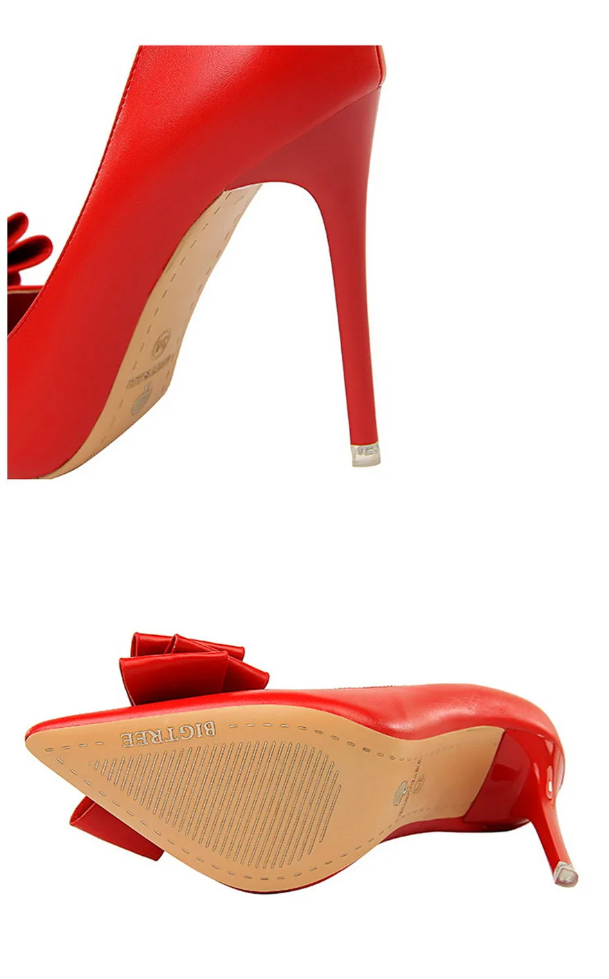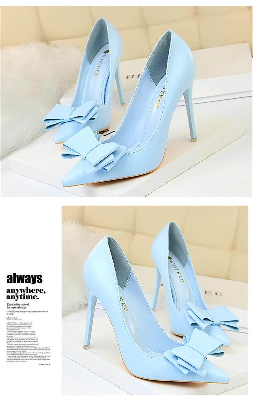 BIGTREE Red Blue Black Shoes Bowknot Sweet Woman Pumps Soft Leather Pointy Toe Women High Heels Stiletto Dress Office Lady Shoes