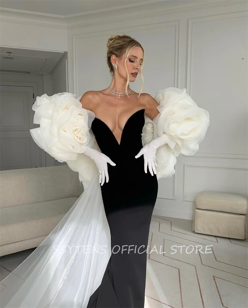 Black Evening Dresses for Women Customized Luxury White 3D Flower Jacket Formal Occasion Dress Floor Israel Long Prom Gowns