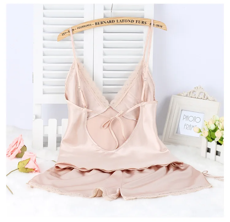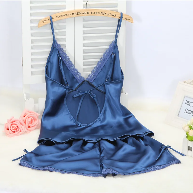 Black Pajamas Suit Lace Up Cami&shorts Set 2Pcs Satin Home Clothes Lady Sexy Lingerie Sleepwear Loungewear Plus Size 3Xl