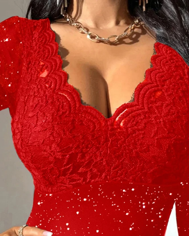 Blouse for Women Slim Deep V Neck T-Shirt 2025 Sexy Scallop Trim Lace Patchwork Glitter Flower Embroidery See-Through Shirt