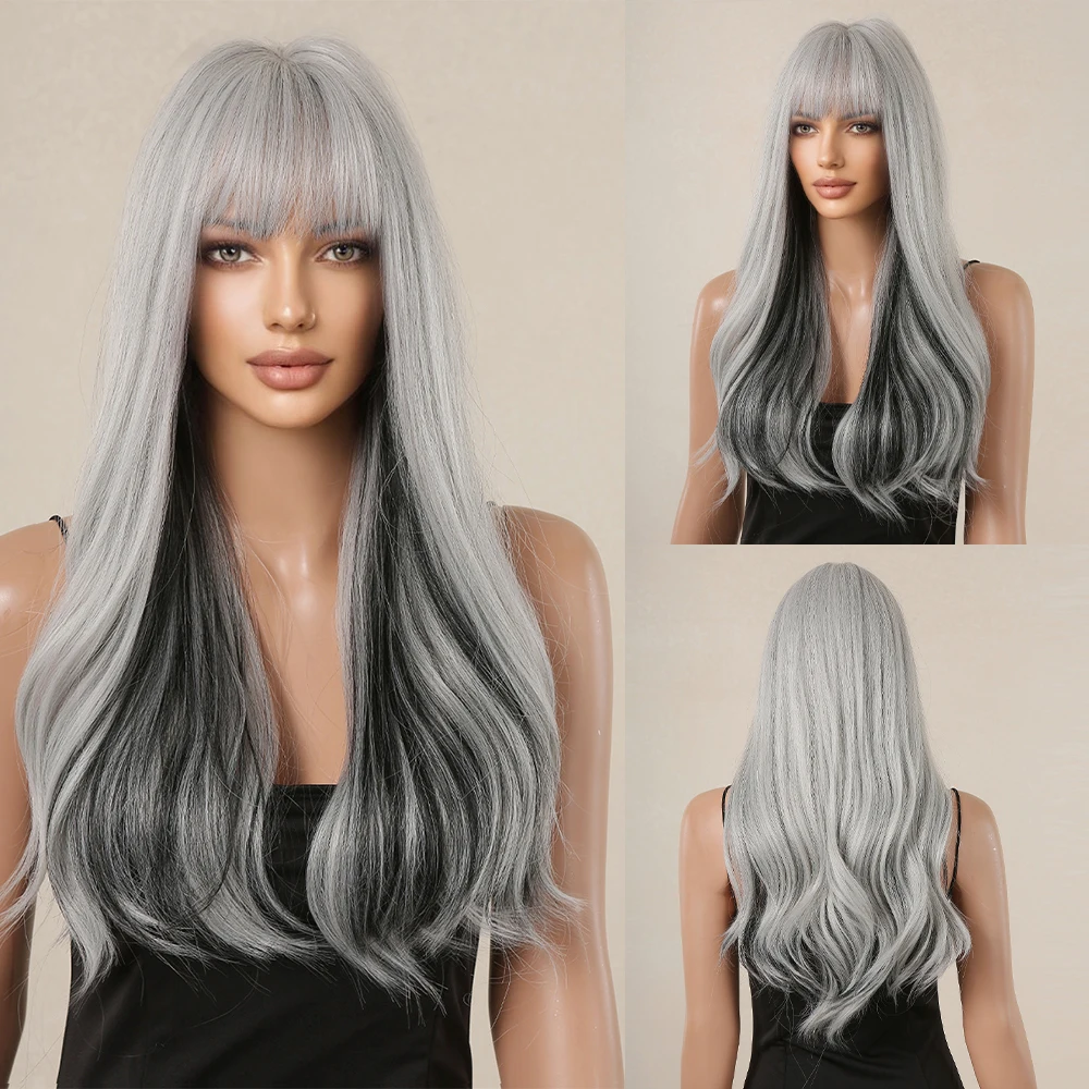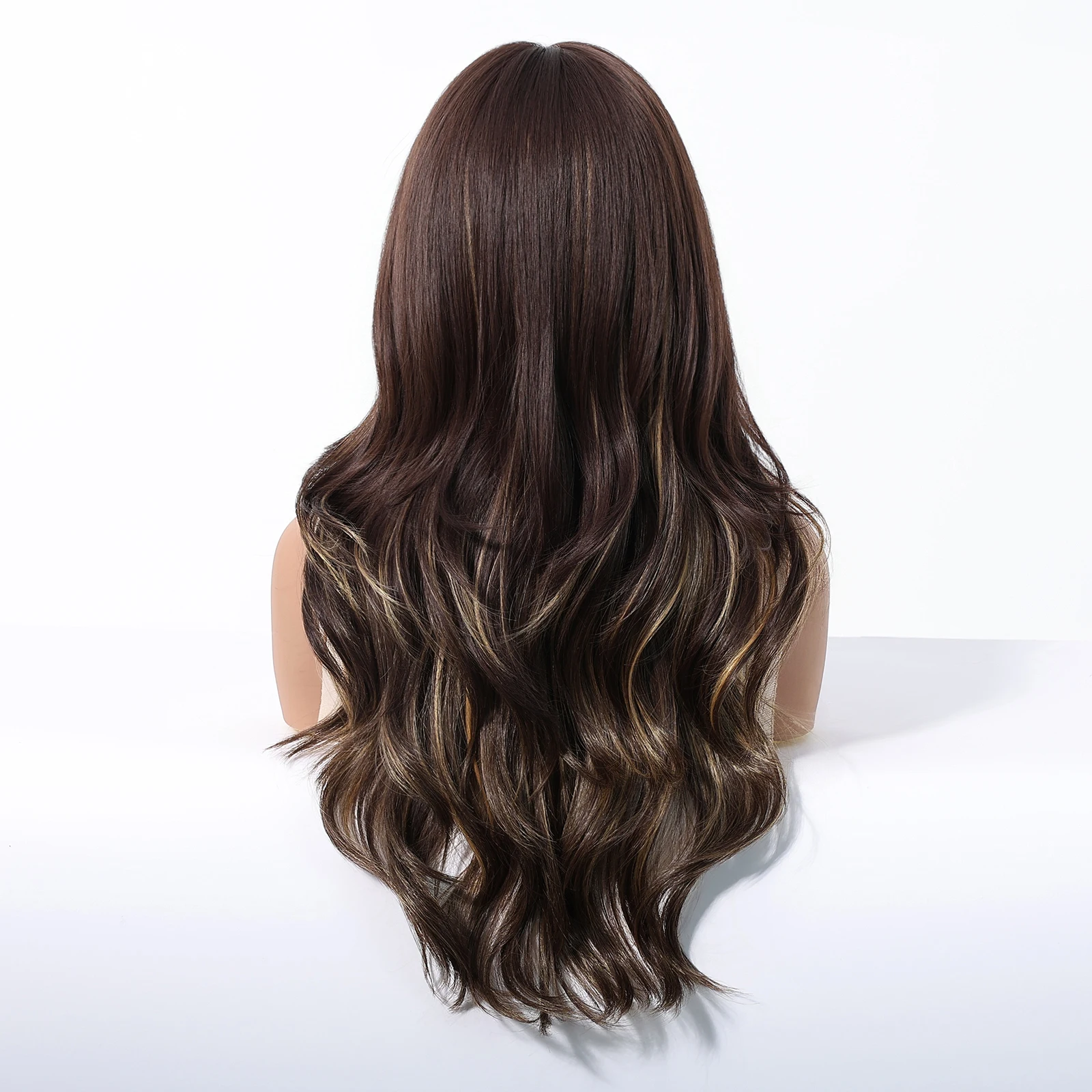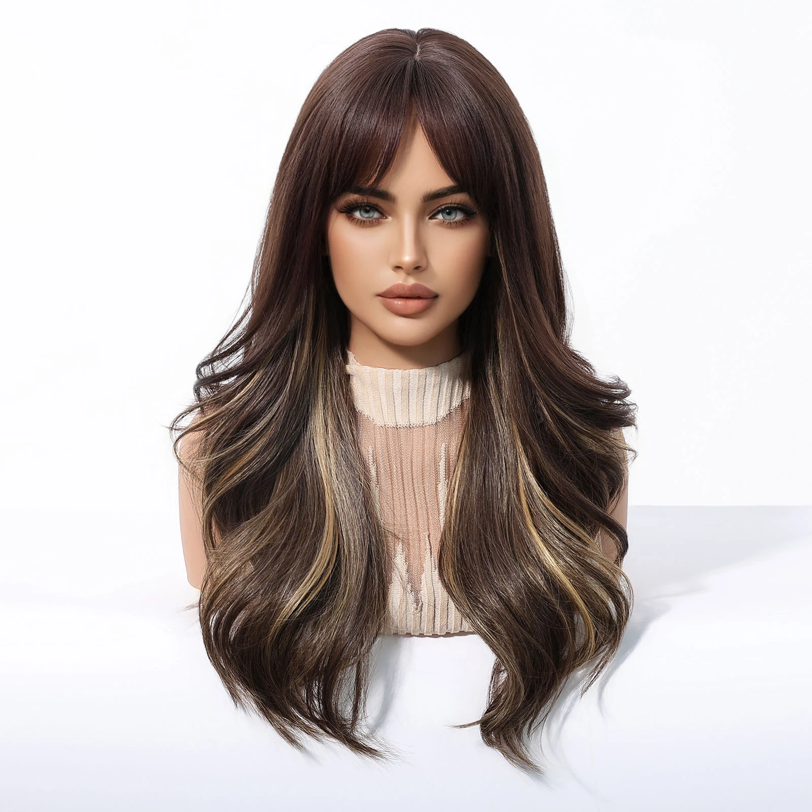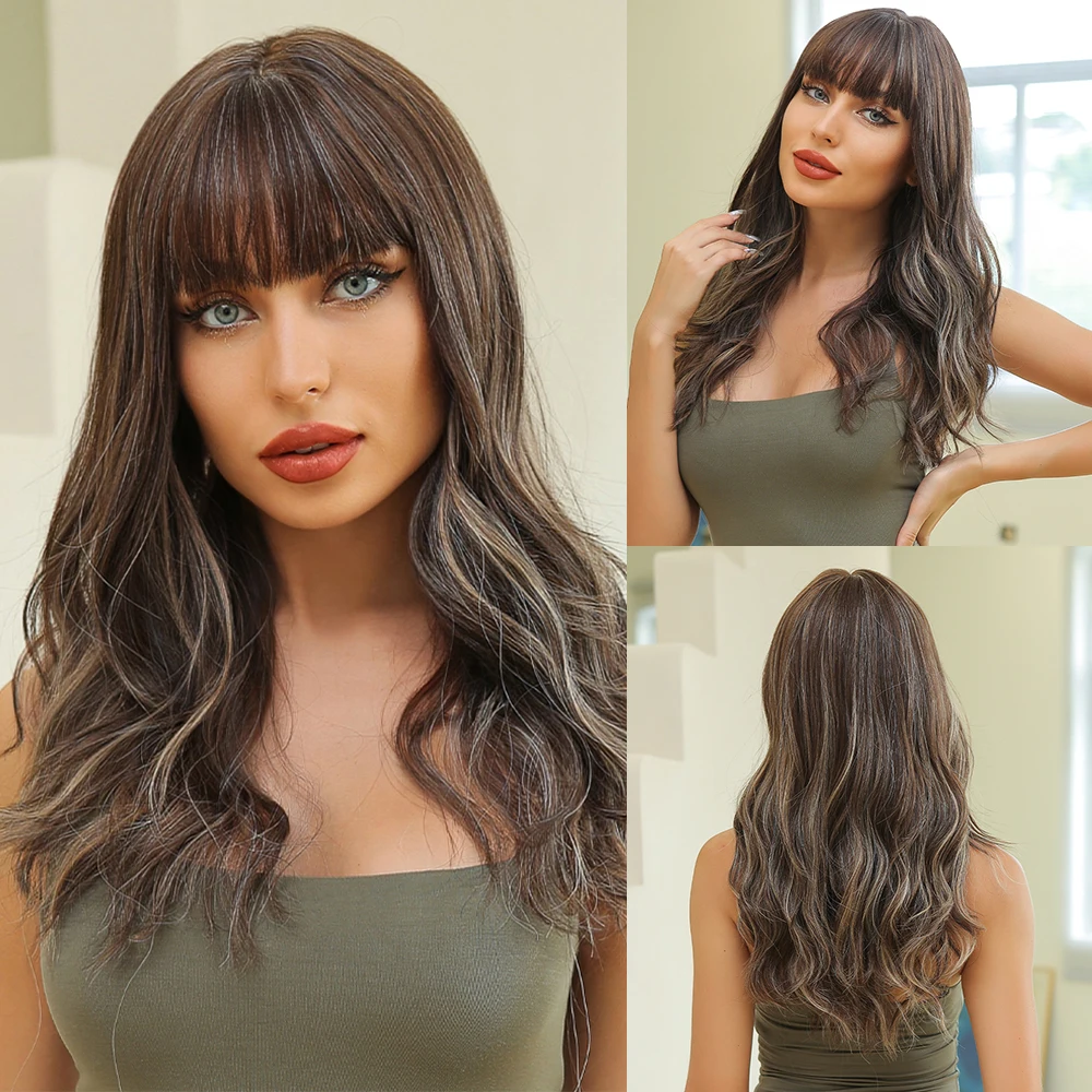 Brown Blonde Highlights Wigs Medium Length Wavy Synthetic Wig With Bangs Natural Body Wave Hair For Women Daily High Temperature