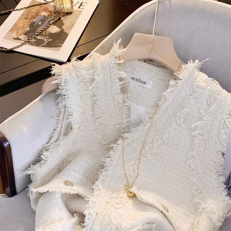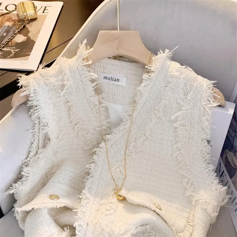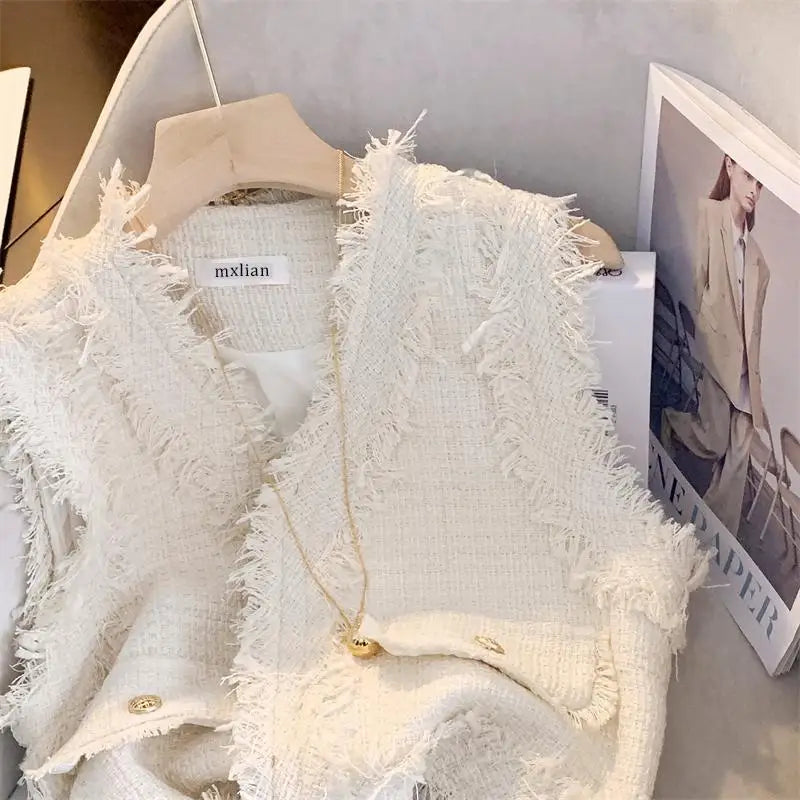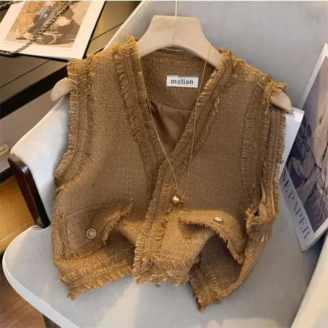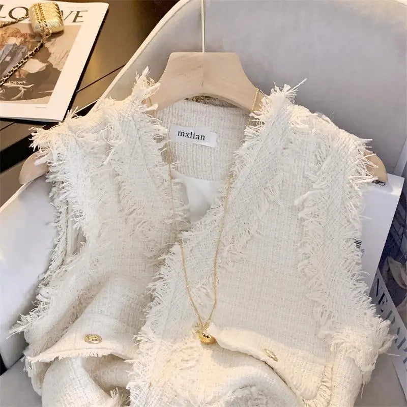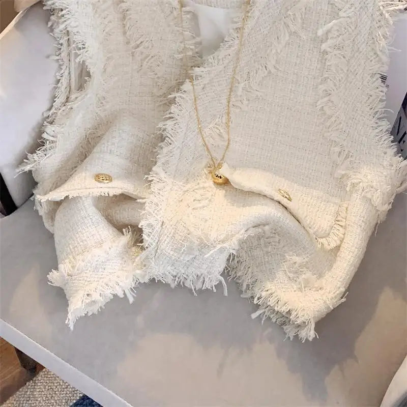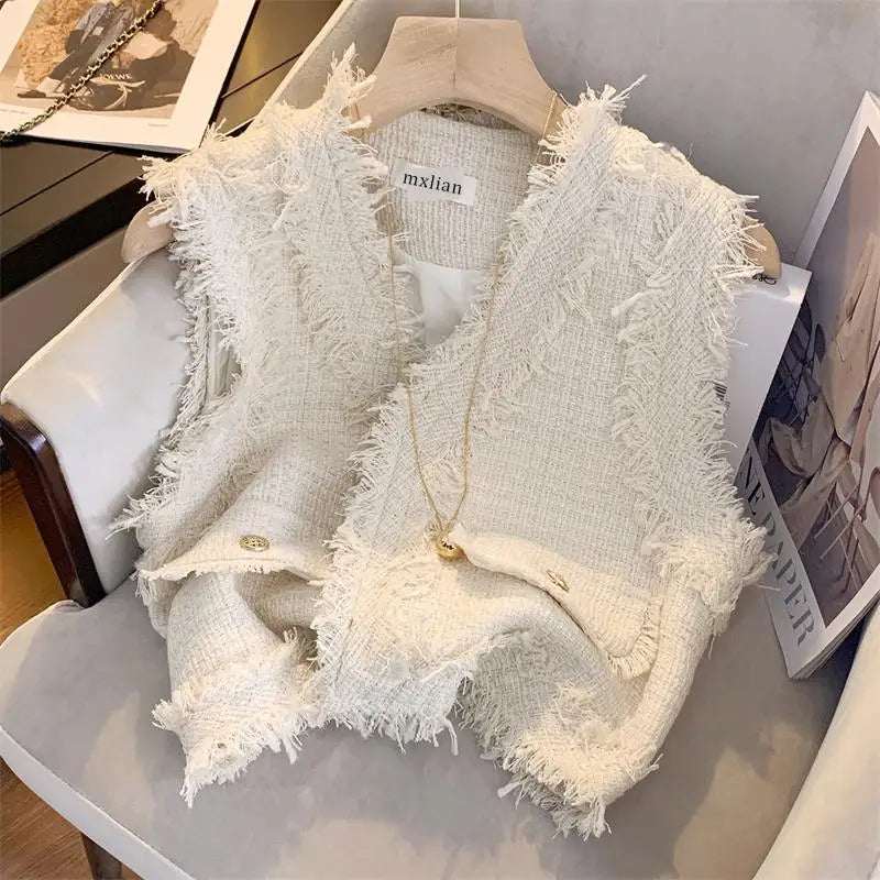 Chalecos Mujer French Fragrant Style Sleeveless Short Coat Black Tassel Vest Women Vintage Crop Top Colete Waistcoat 2024