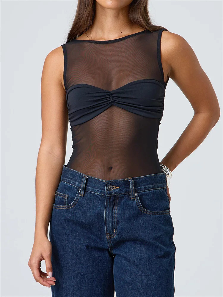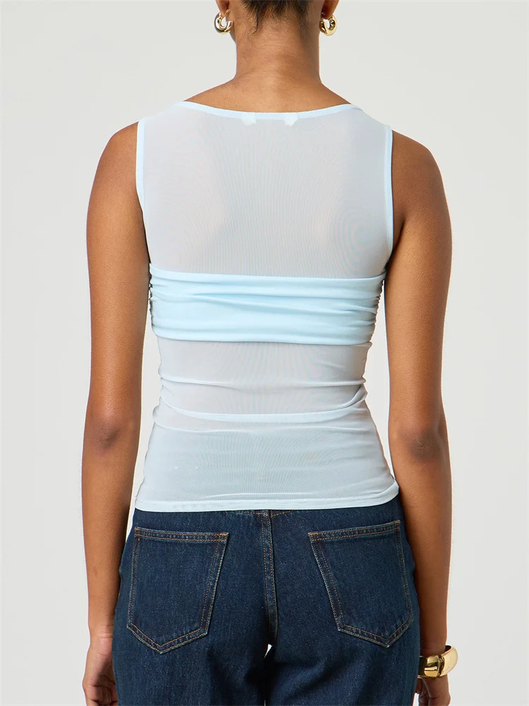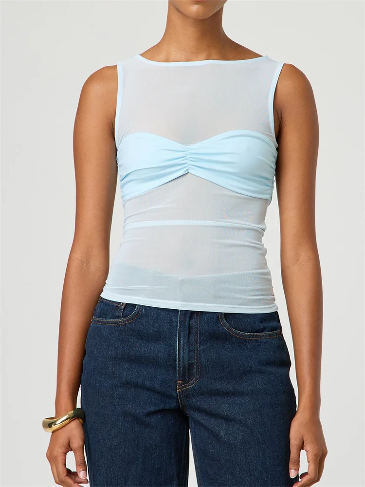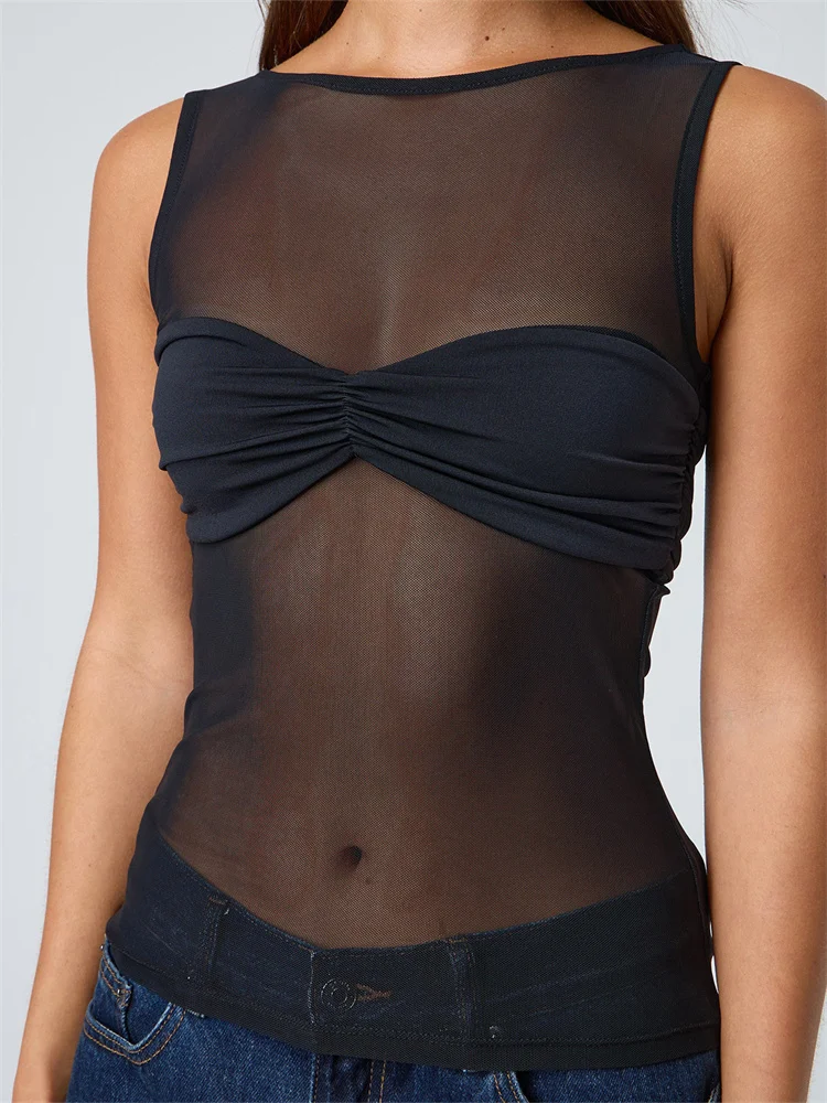 CHRONSTYLE Sexy Women Mesh Sheer See Through Tank Tops Sleeveless Round Neck Solid Color Slim Fit Ruched Patchwork Vest 2025 New