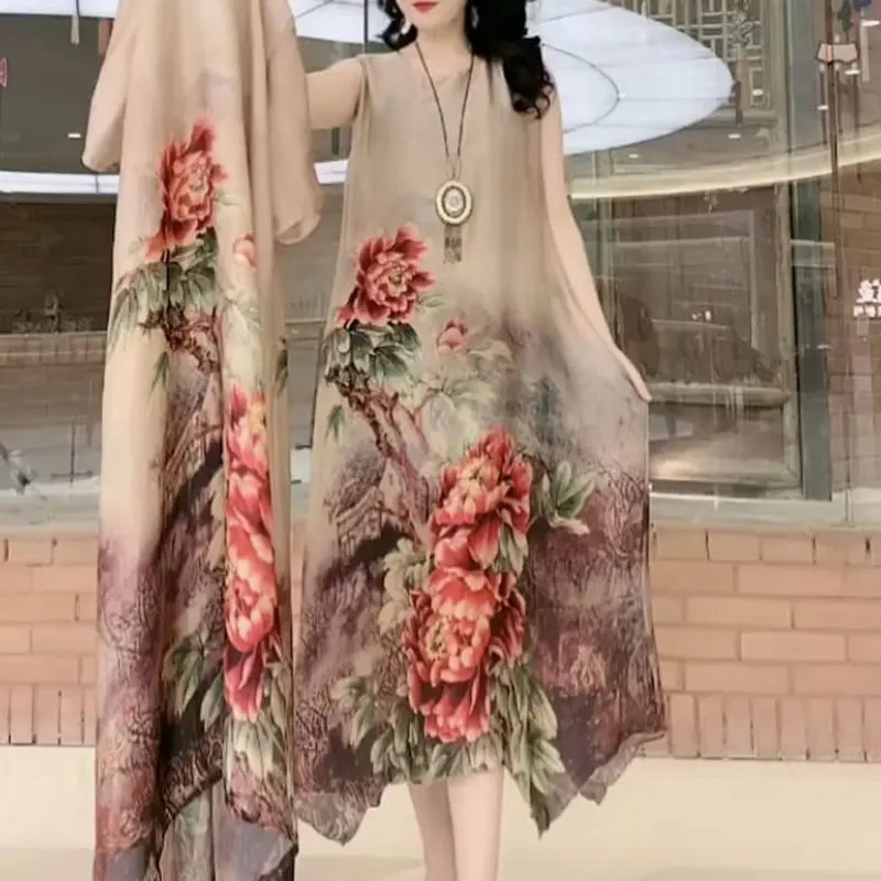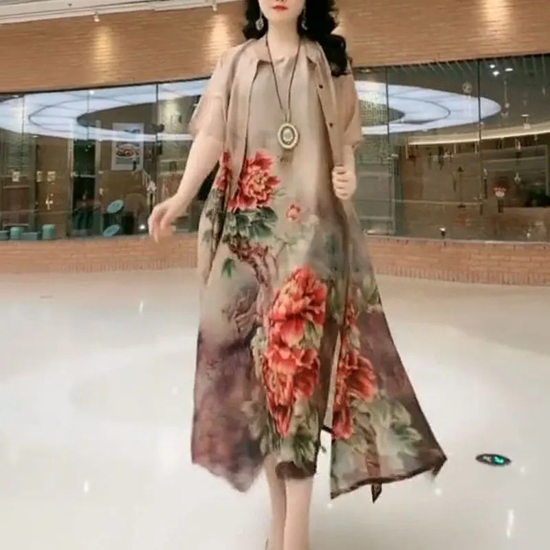 Commute Floral Printed Matching Sets Two Piece Set Casual Round Neck Spring Summer Female Fashion Irregular Hem Long Dress Sets