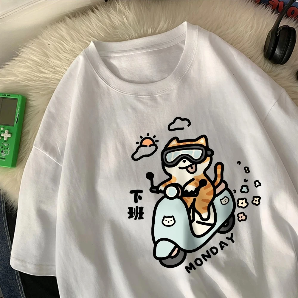 Cute Cat Riding Home After Work on Monday Women T-Shirts Cartoon Printed Tops Round Neck Soft T Shirt Summer Clothing