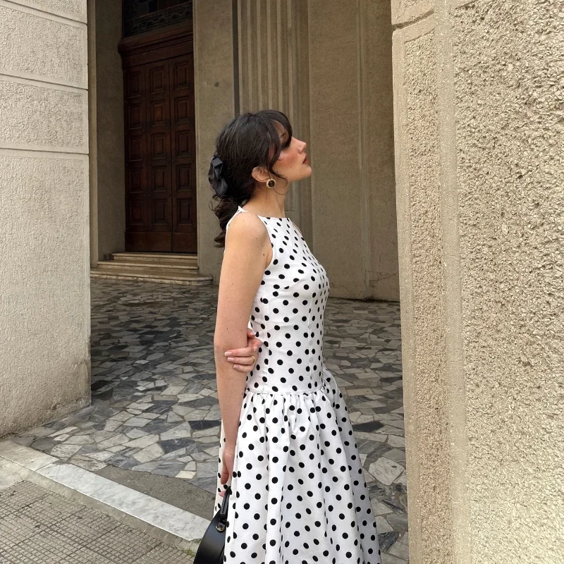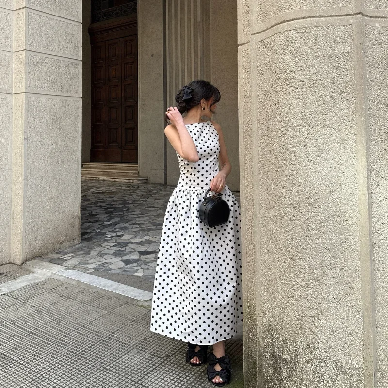 Fashion Polka Solid Slim Vestido Lady Elegant Chic Sleeveless Off Shoulder Pleat Square Neck Maxi Dress Summer Dinner Party Wear