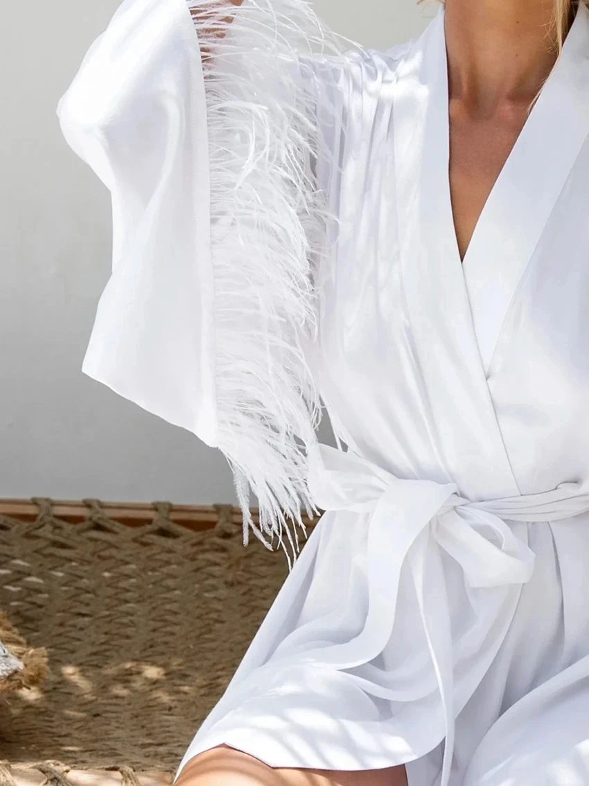 Feathers Patchwork Women'S Robe Sexy V-Neck Sleepwear Long Sleeve Lace Up Bathrobe Causal White Ladies Home Clothes