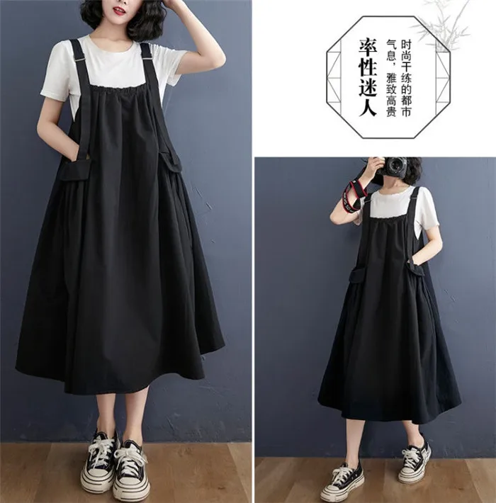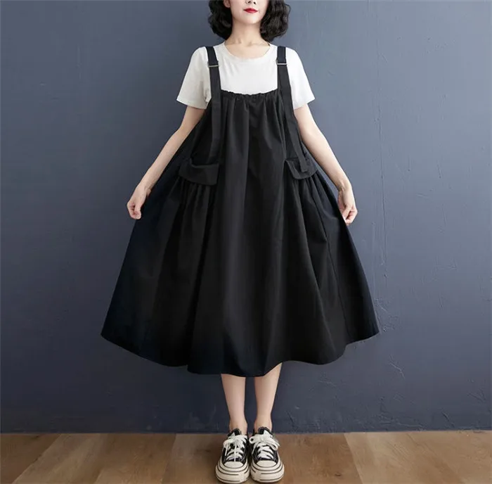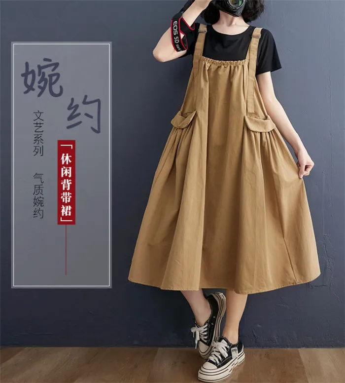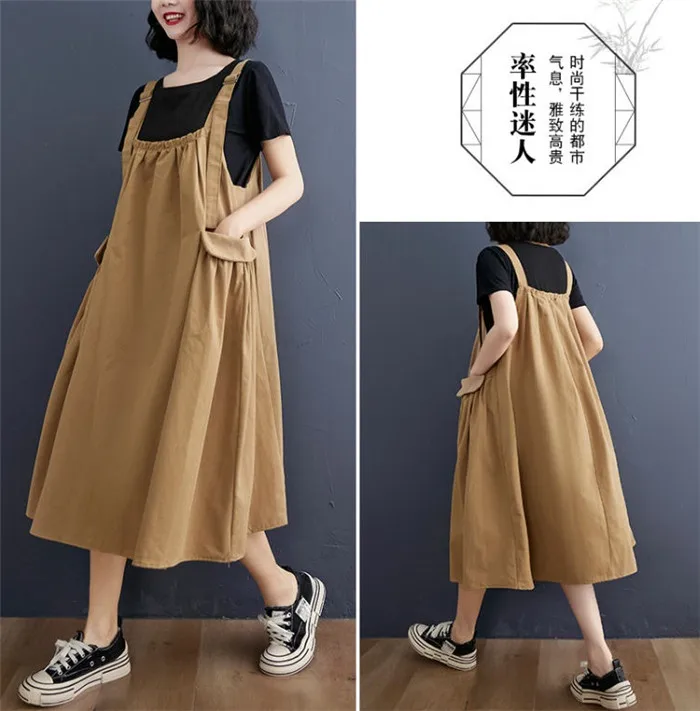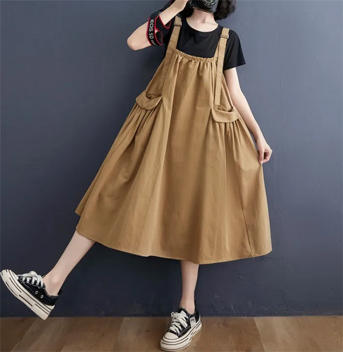 Female Dress Summer Mid-Length Loose Solid Color Pocket Swing Chic Casual Straps Dresses New Women Dress Vestidos Selling