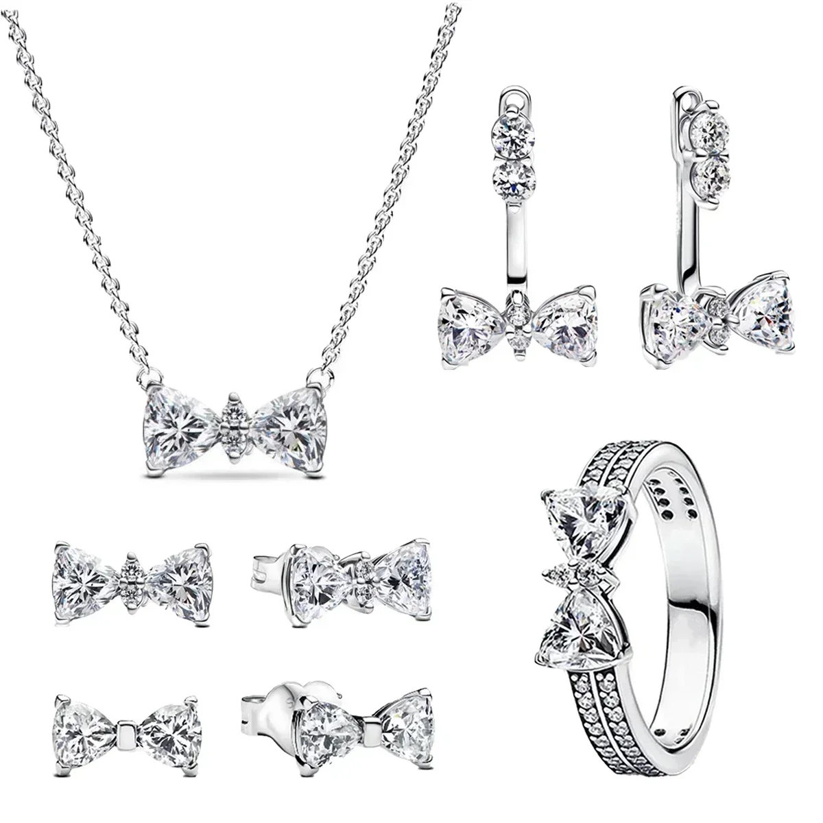 Fine Jewelry Pink Shining Bow Set Ring Earrings Bracelet Necklace Zircon Original 925 Sterling Silver DIY Women DIY Birthdy Gift