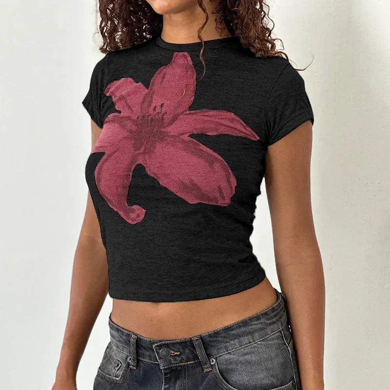 Floral Print Short Sleeve T-Shirt 2025 Women's Sexy Slim Fit BM Top Hot Girl Trendy Streetwear Casual Fashion