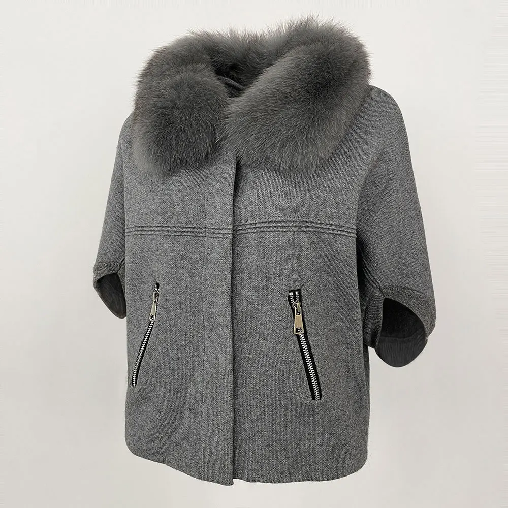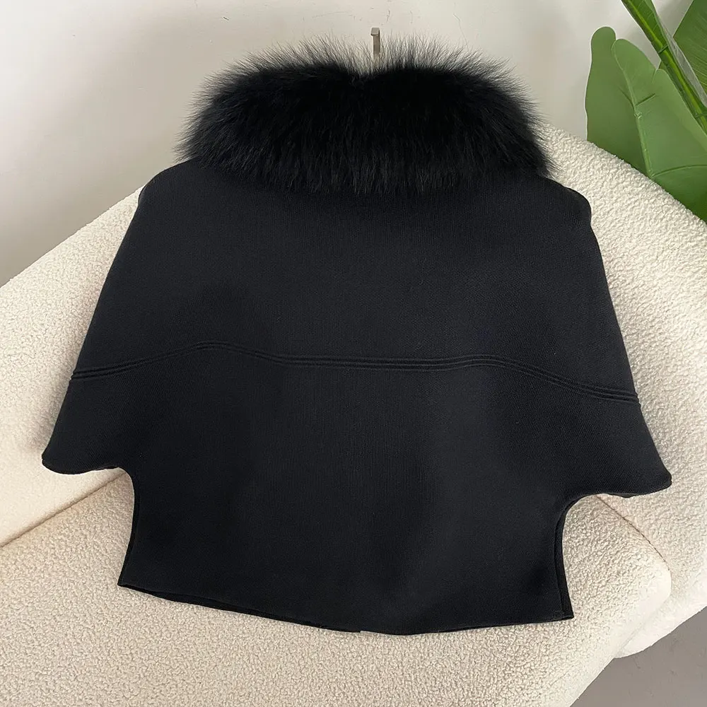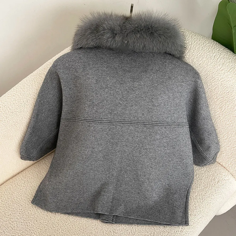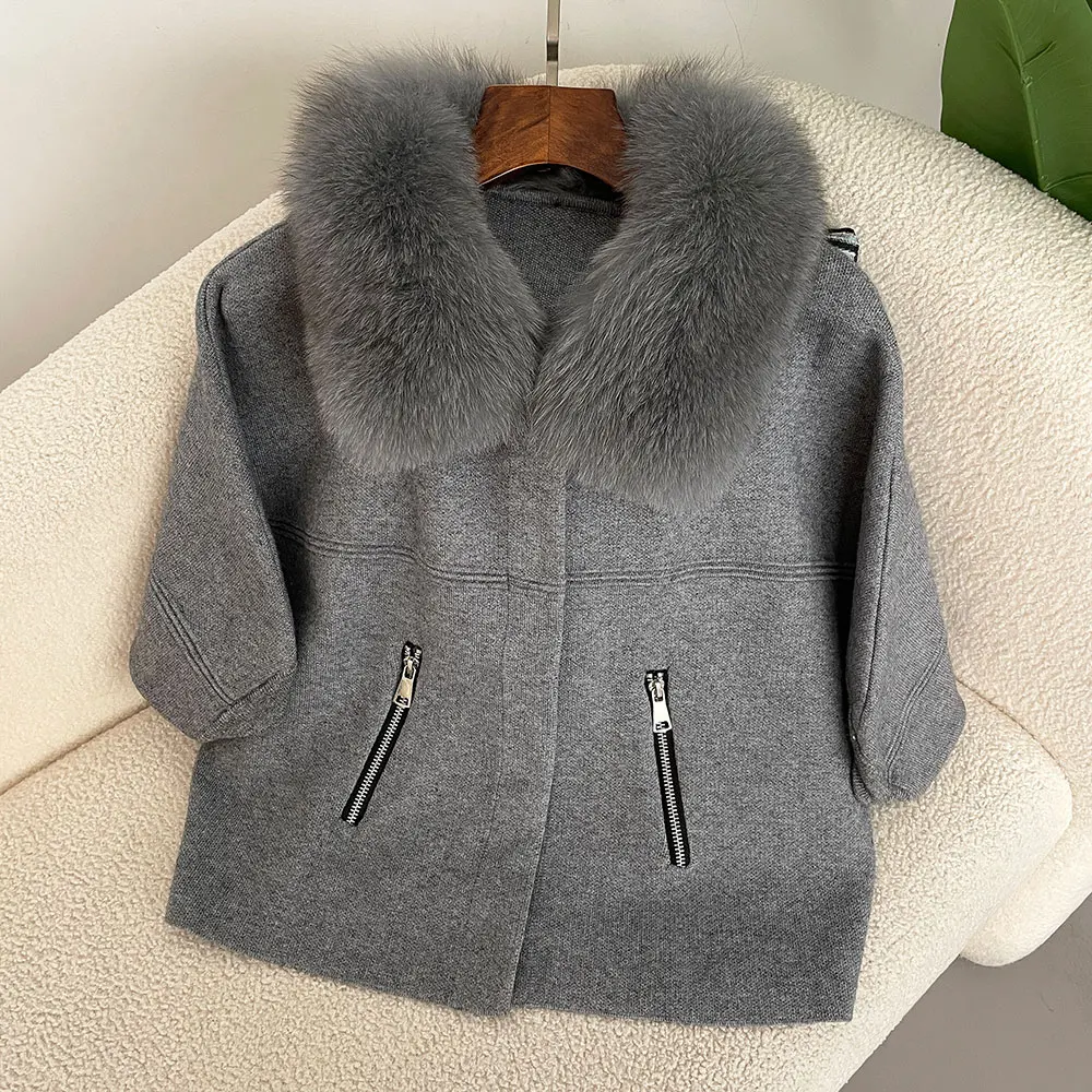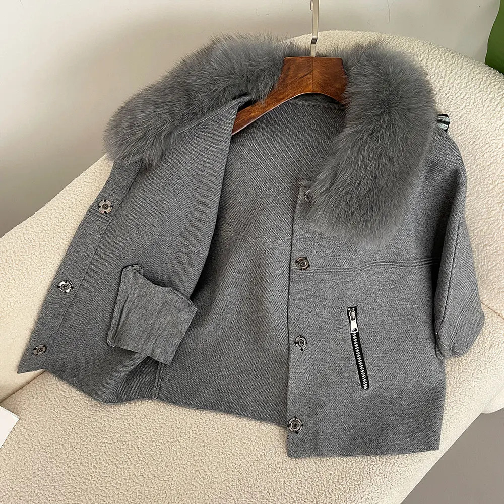 FURYOURSELF 2025 New Real Fox Raccoon Fur Collar Coat Knitted Sweater Women Short Sleeve Jacket Thick Warm Outerwear streetwear