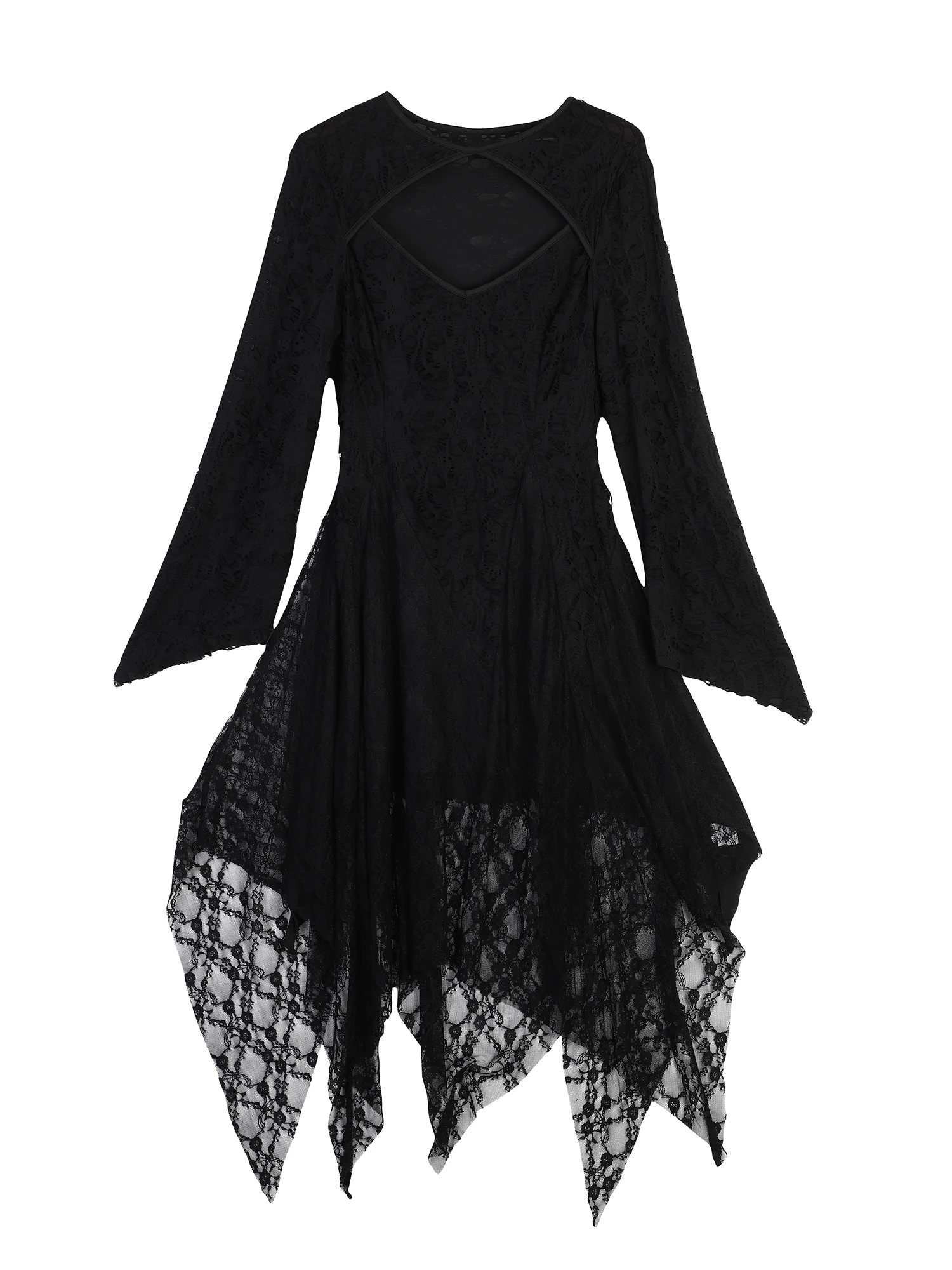 Halloween Plus Size Women's Gothic Lace Flare Sleeve A-Line Midi Dress Ladies Asymmetrical Hem Punk Party Costplay Dress 1XL-6XL