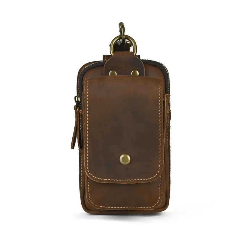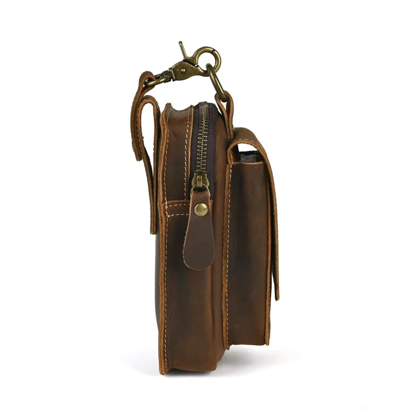 Hardware Clasp Waist Bags Men First Layer Genuine Leather Hang Bag Cowhide Wallets through the belt Zipper Retro Phone Purse