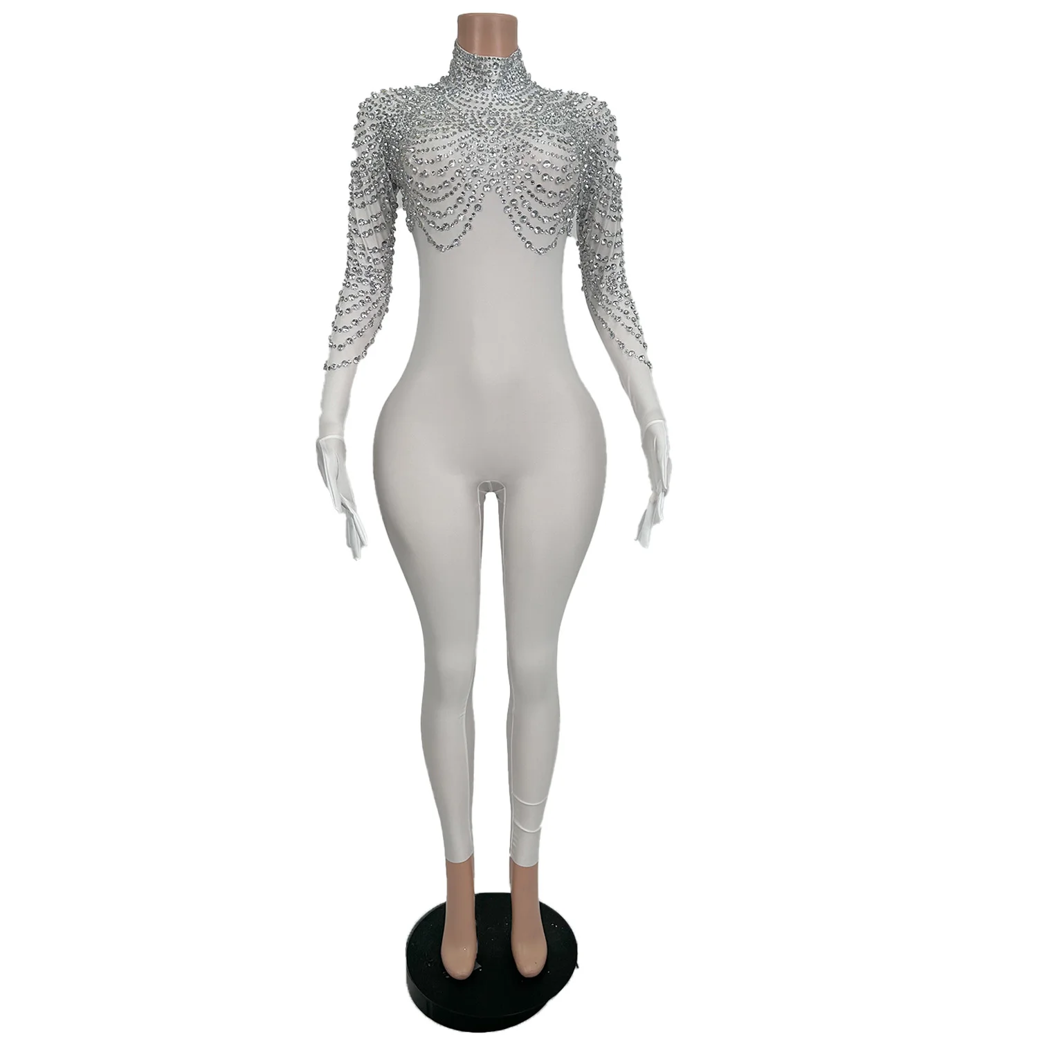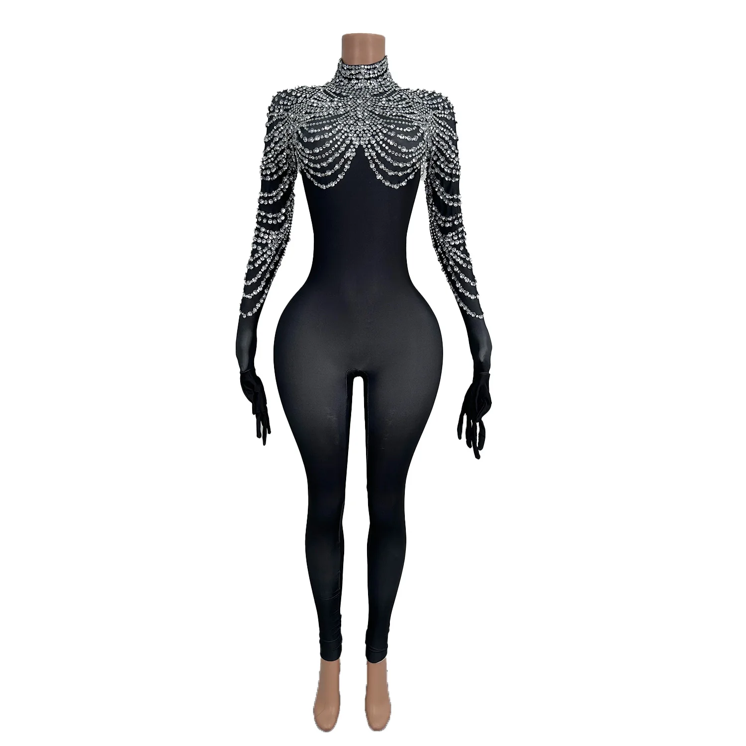High Elasticity Large-Sized Women Jumpsuit Shiny Red Shawl Rhinestone Tight Pants with Glove Acrobatic Pole Dance Costume pijian