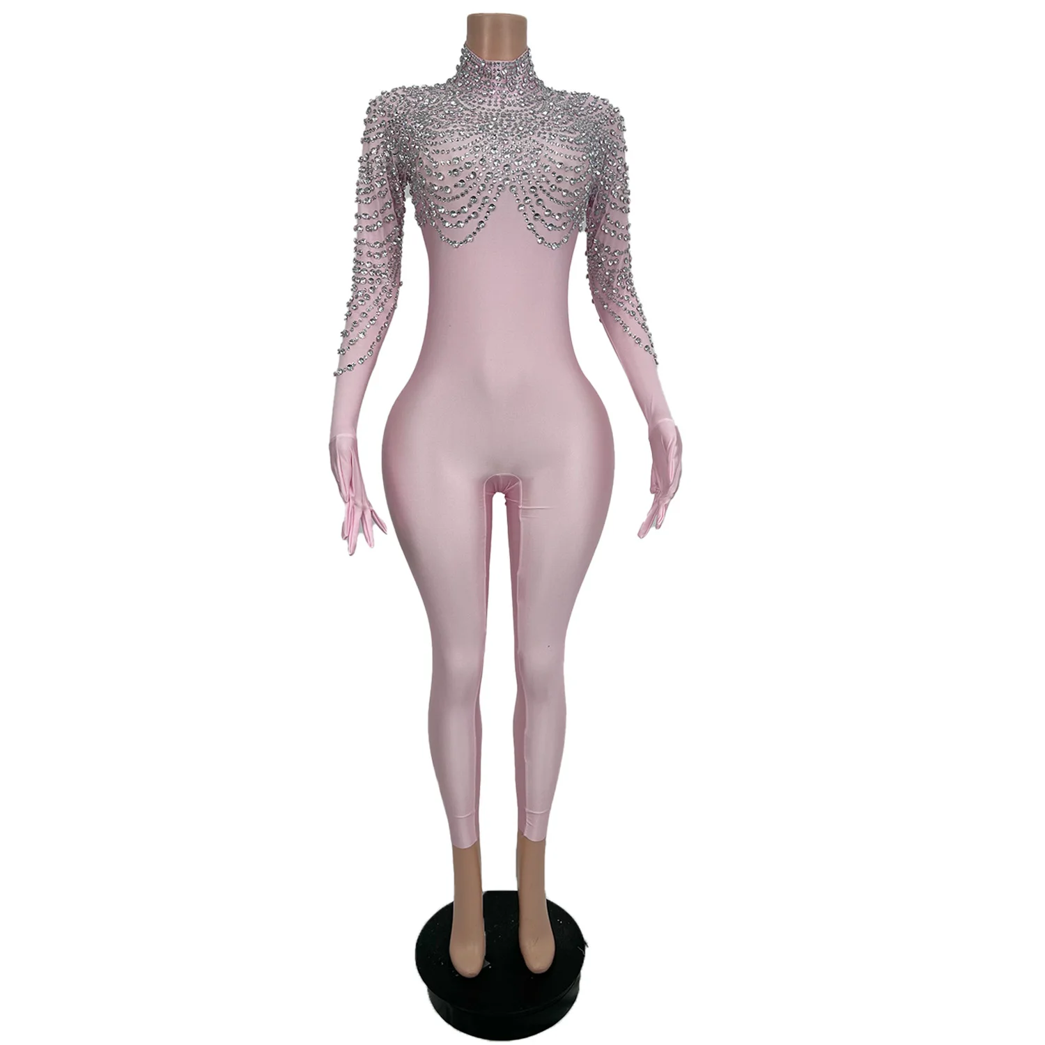 High Elasticity Large Sized Women Jumpsuit Shiny Red Shawl Rhinestone Tight Pants with Glove Acrobatic Pole Dance Costume pijian