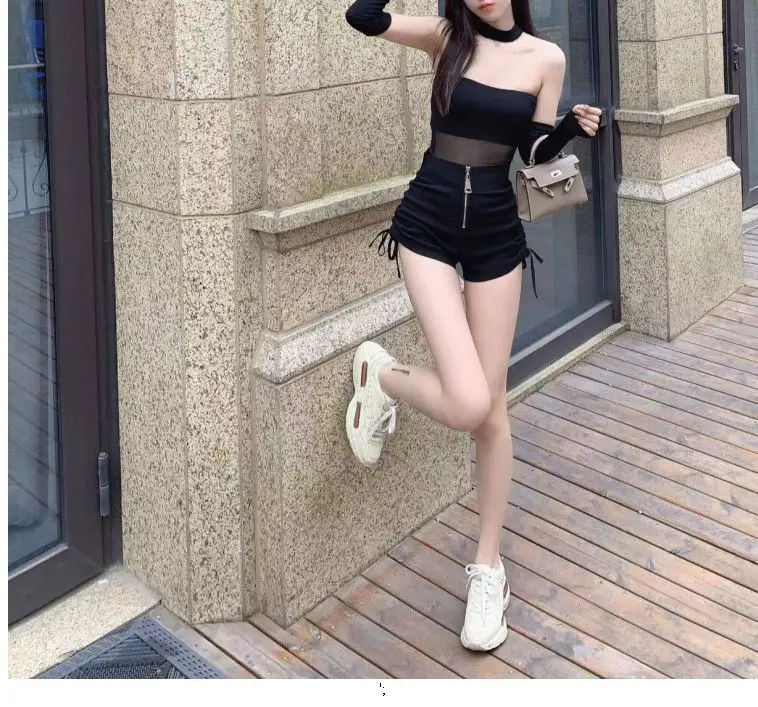 High Waist Shirring Black Bodycon Shorts Female Summer All-match Pleated Elasticity Elastic Waist Straight Women Slim Trousers