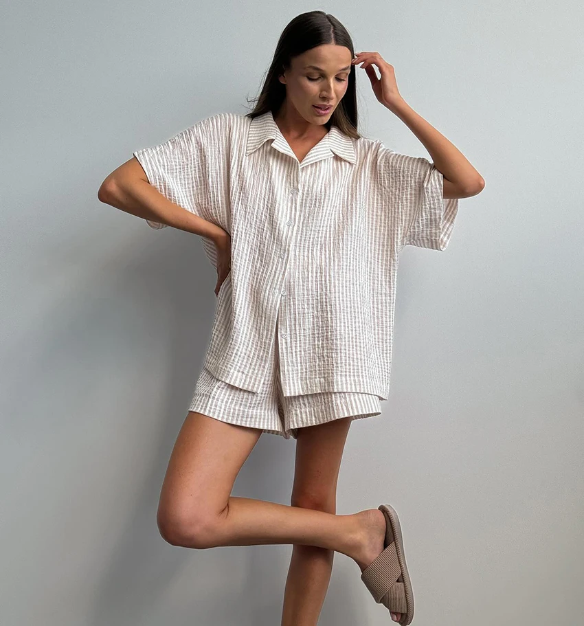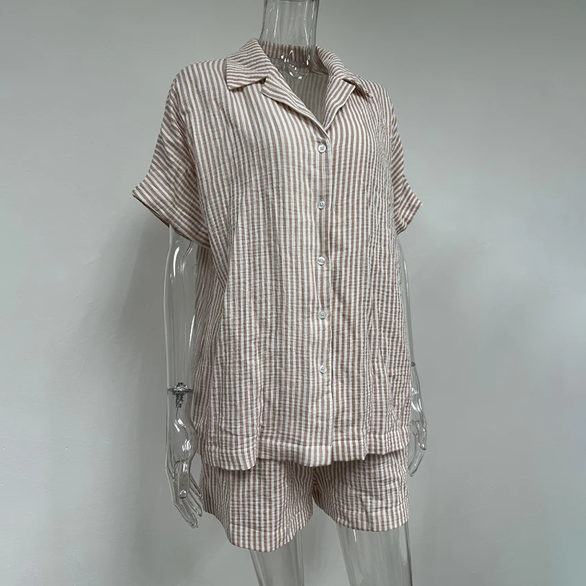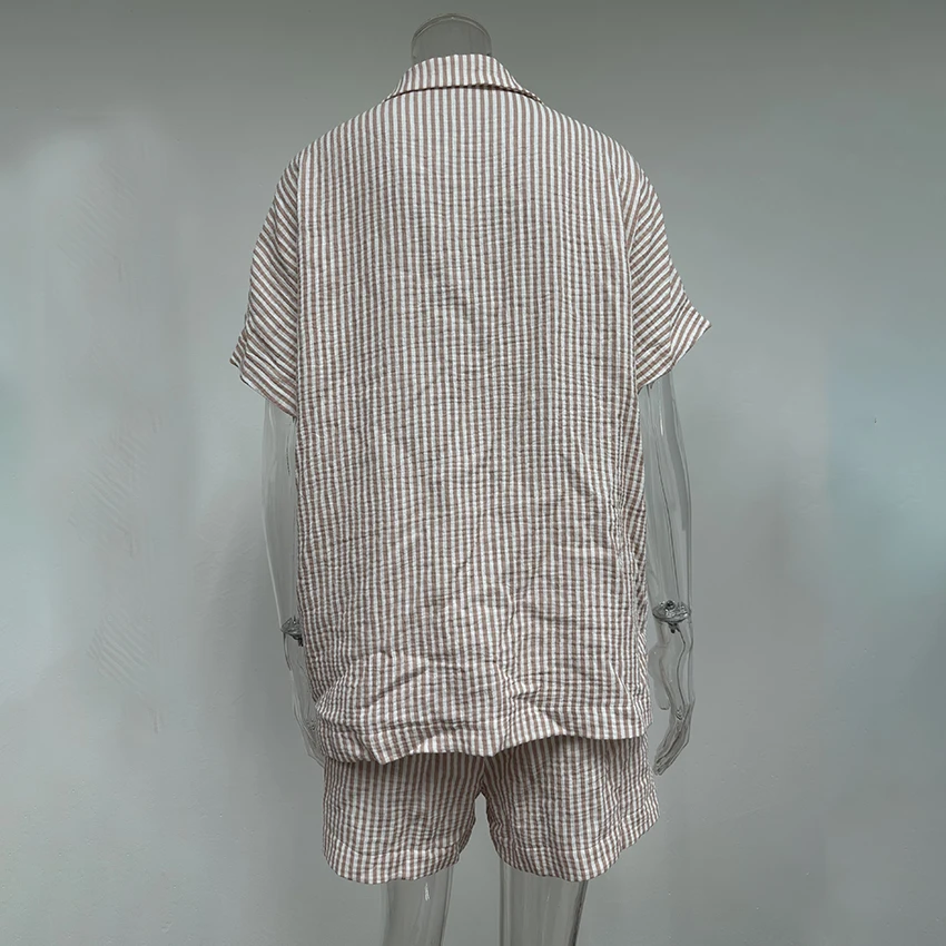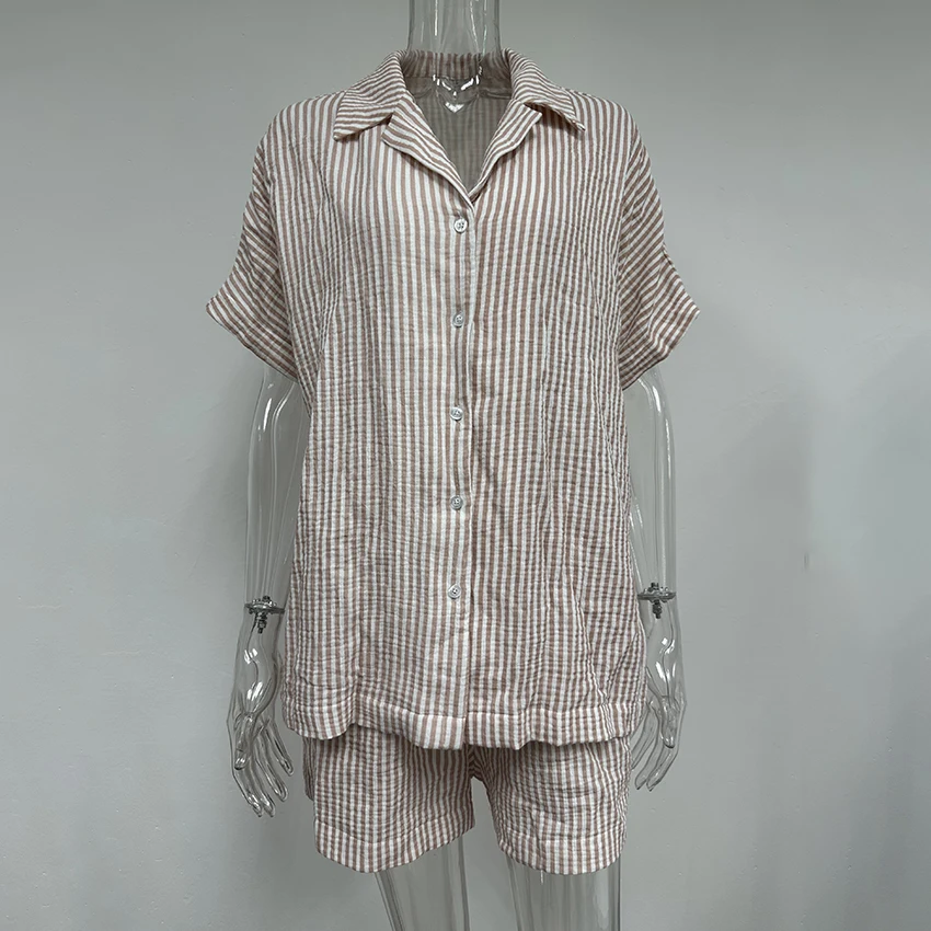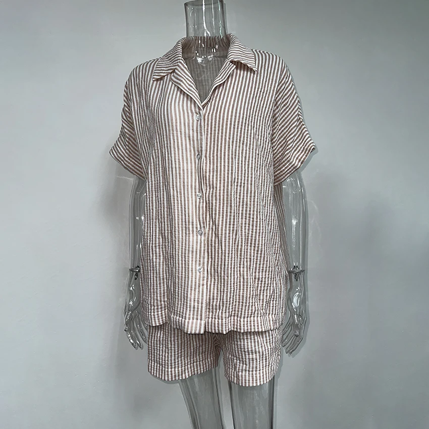 Hiloc Elegant Cotton Stripe Shorts Suits Pajamas Summer Short Sleeve Blouse With Elastic Waist Shorts 2 Piece Sets Home Outfits