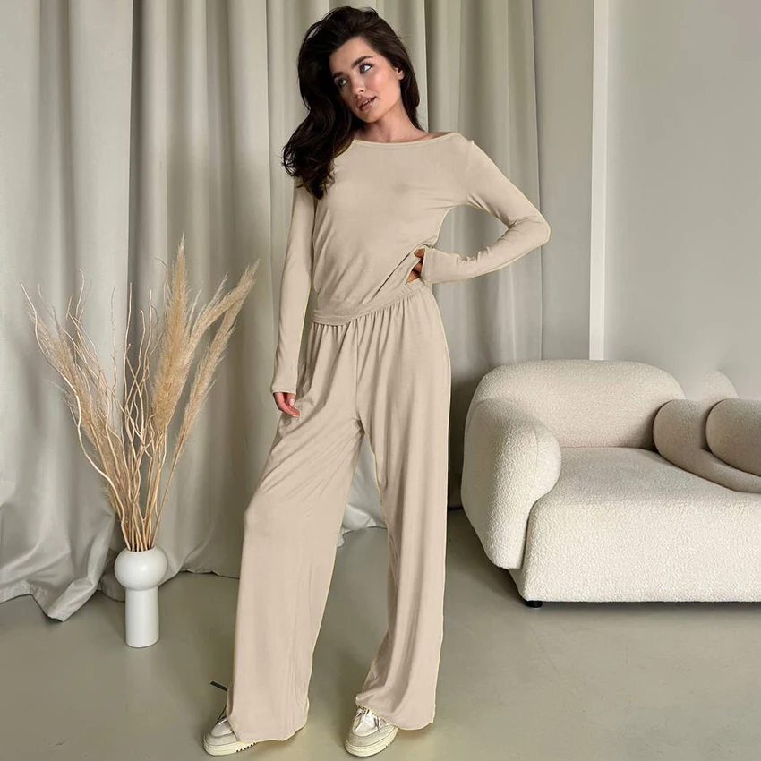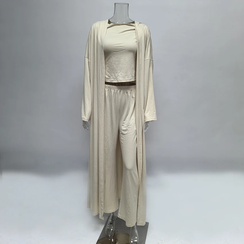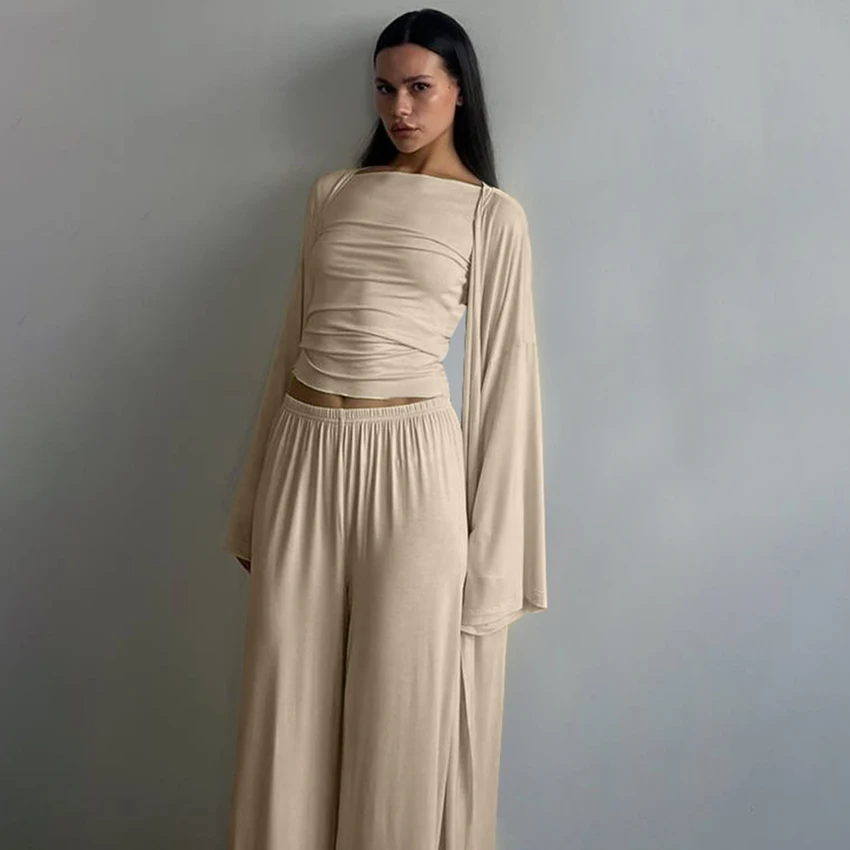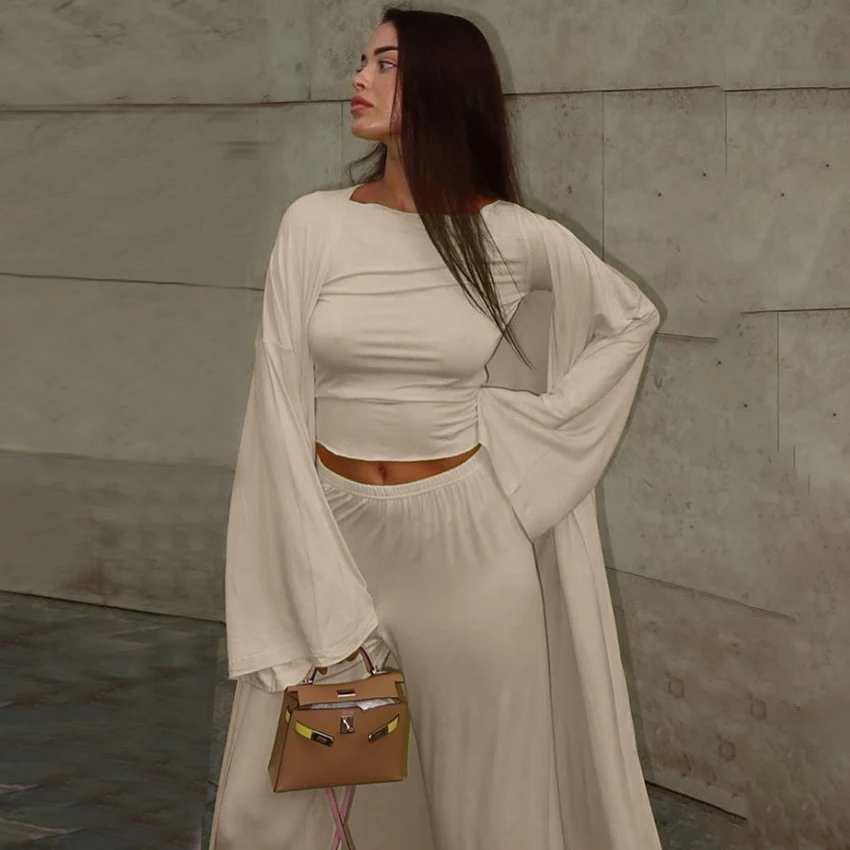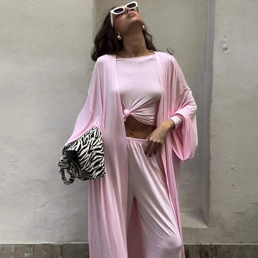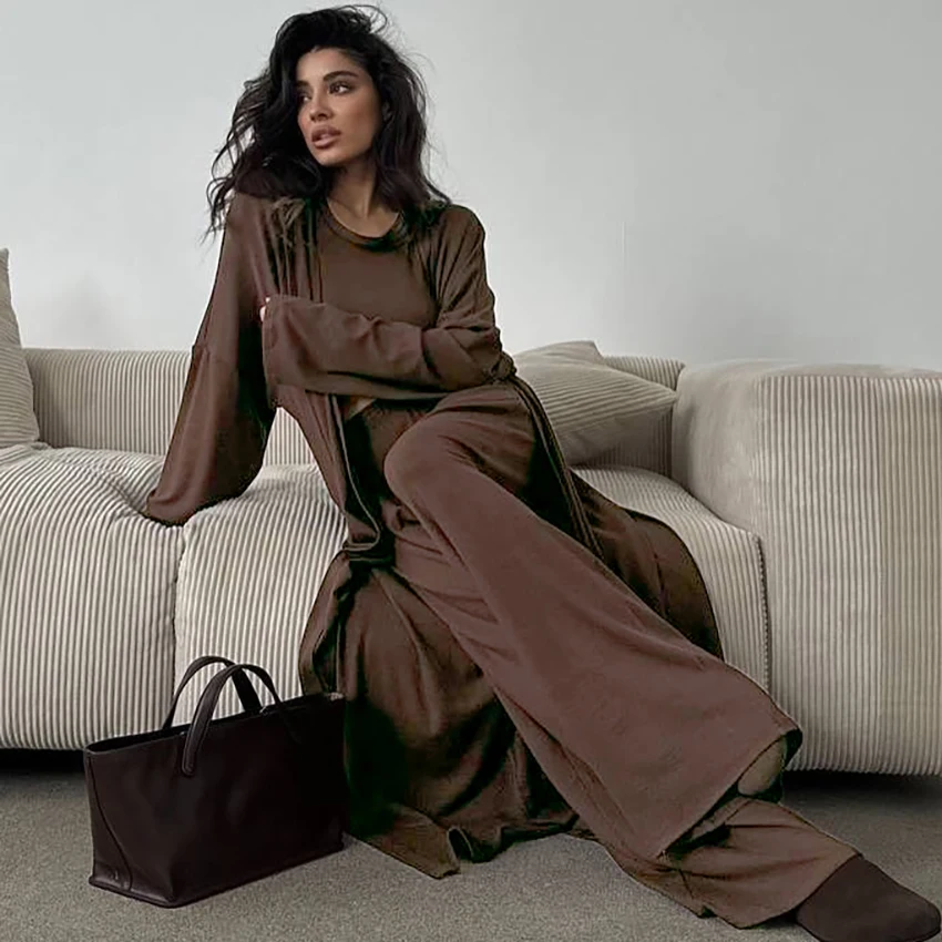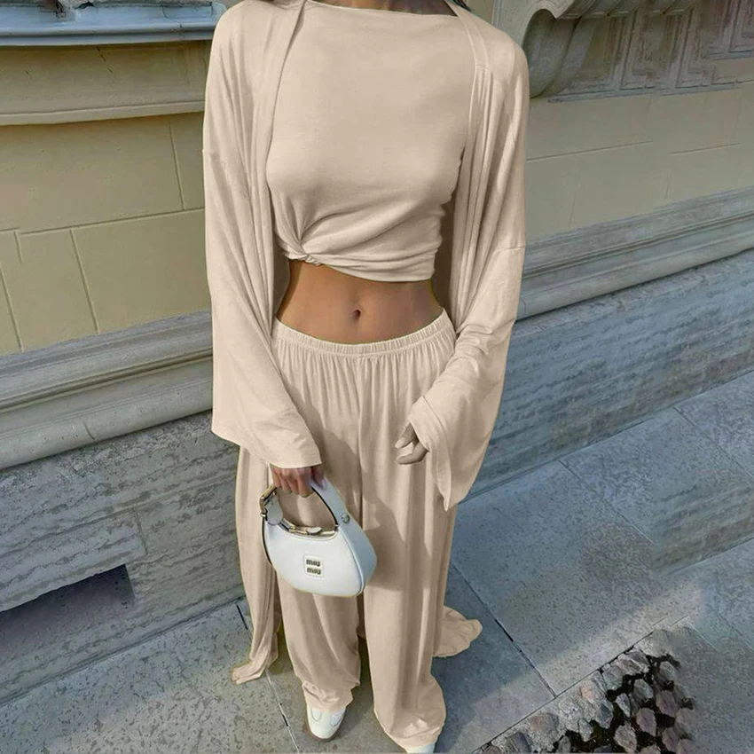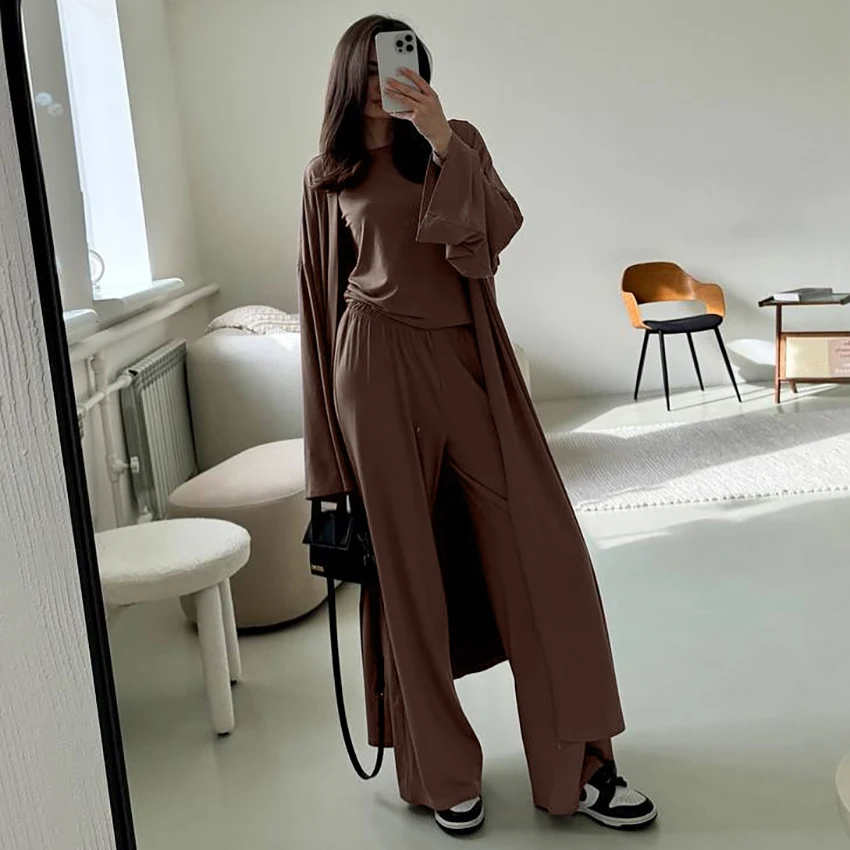 Hiloc Elegant Knit 3 Piece Sets Summer Casual Loose Sleepwear Street Chic Elastic Waist Pants Fashion Long Sleeve Shirts 2025