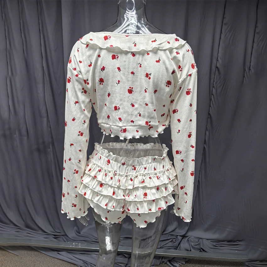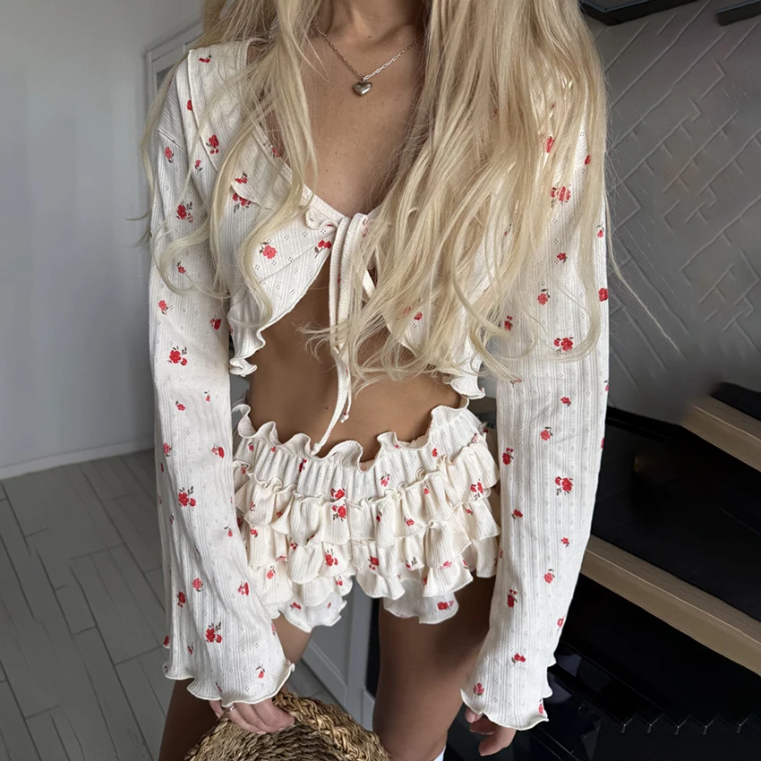 Hiloc Home Ruffles Cute Print Shorts Suits Pajamas For Women Summer Flare Sleeve Wrap Blouse With Elastic Waist Shorts 2 Piece