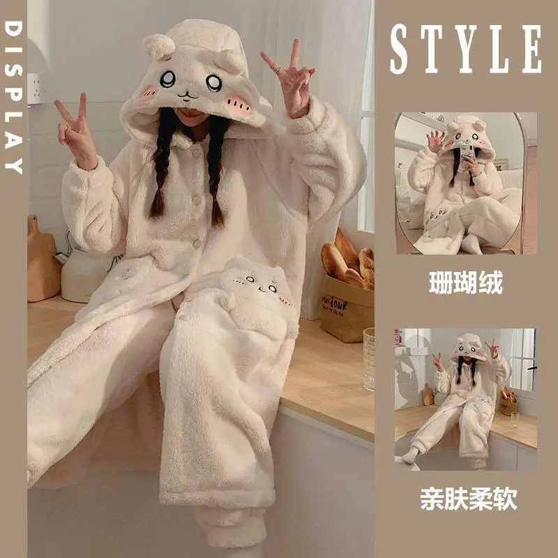 Kawaii Chiikawacoral Velvet Hooded Pajamas for Girls New Cute Cartoon Hachiware Usagi Women's Velvet Home Clothes Autumn Winter
