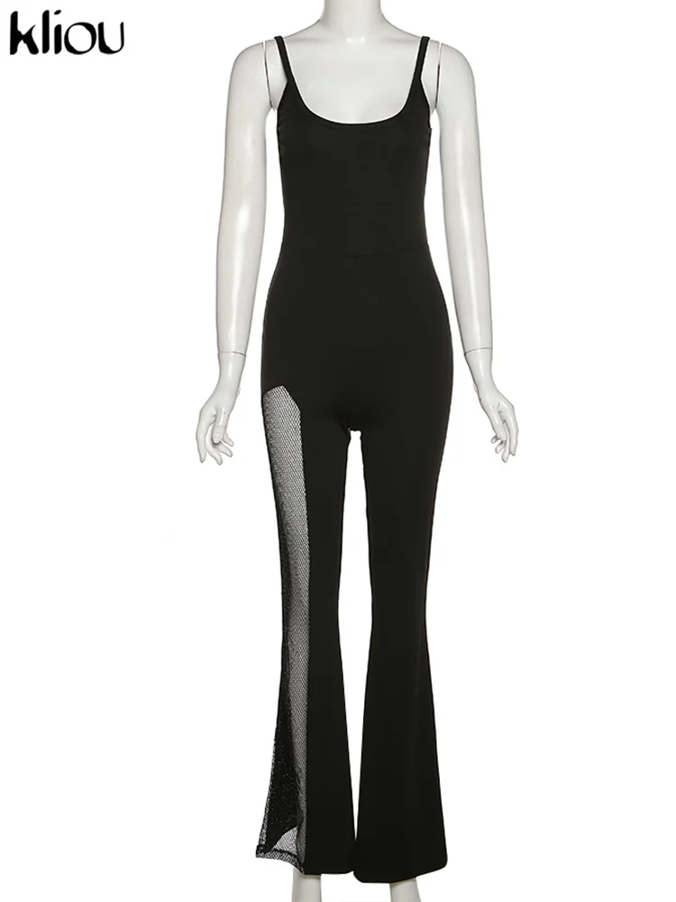 Kliou Shiny Silver Net Jumpsuit Women Fashion Patchwork Mesh Classic Style One Pieces Hipster Twinkle Sleeveless High Streetwear
