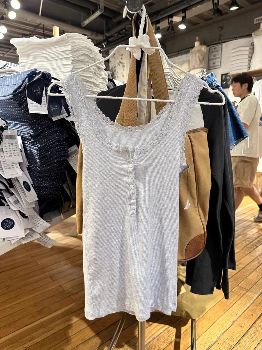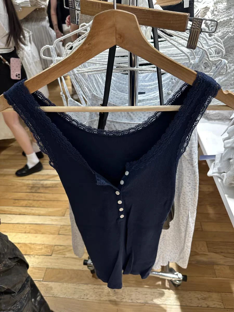 Lace Trim Solid Ribbed Tank Top for Woman Spring Buttons U Collar Sleeveless Slim Camis Simple Cotton Basic Vest Sweet Y2k Tops