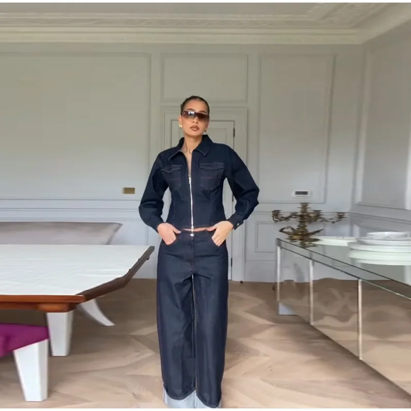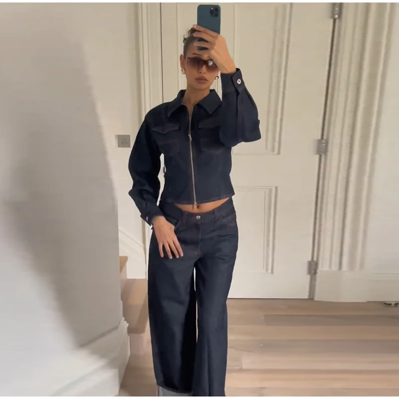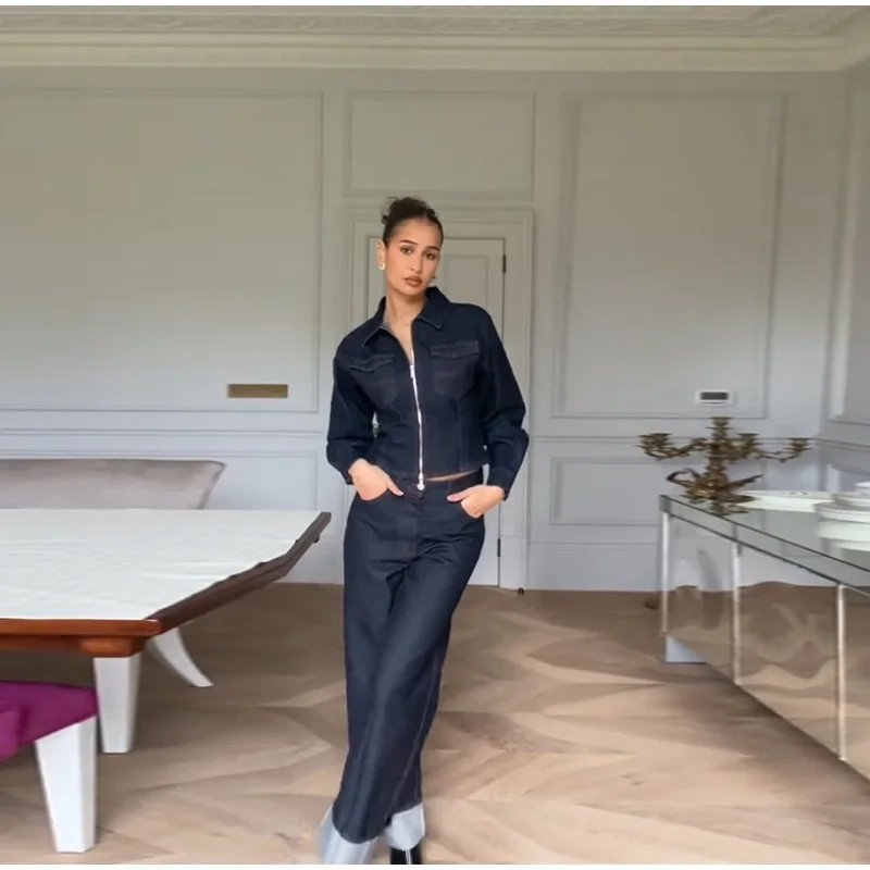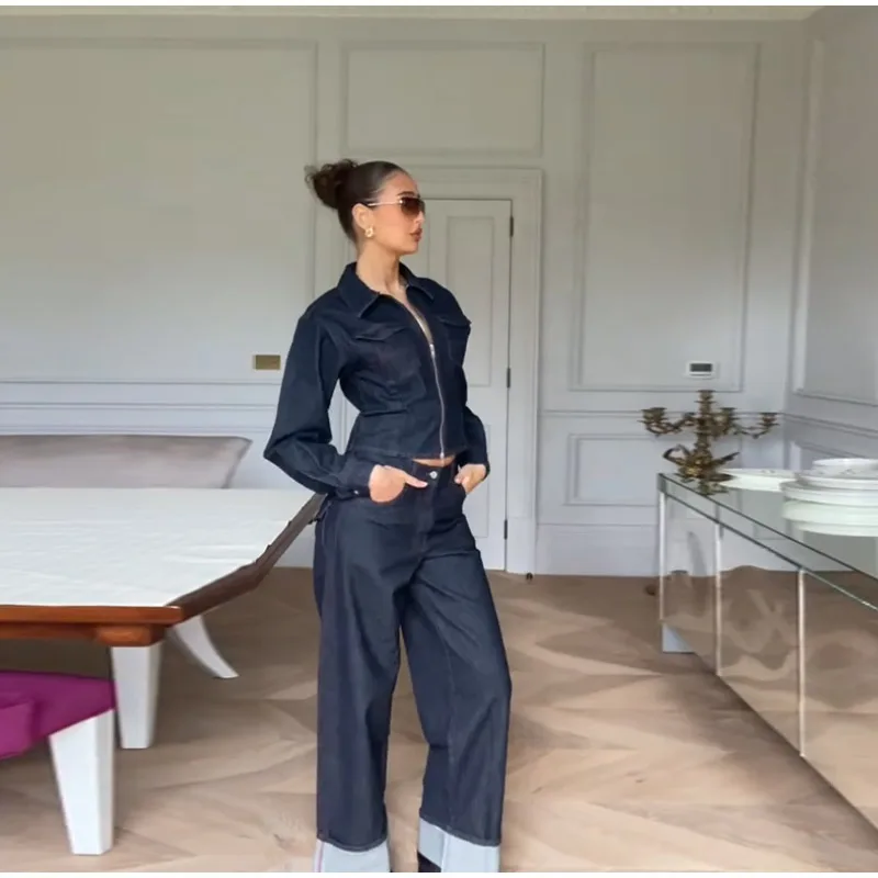 Lapel Zipper Denim Jackets Pants Sets Women Casual Pockets Short Jackets Suit With High Waist Jeans Lady Chic High Street Outfit