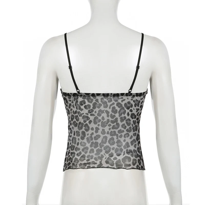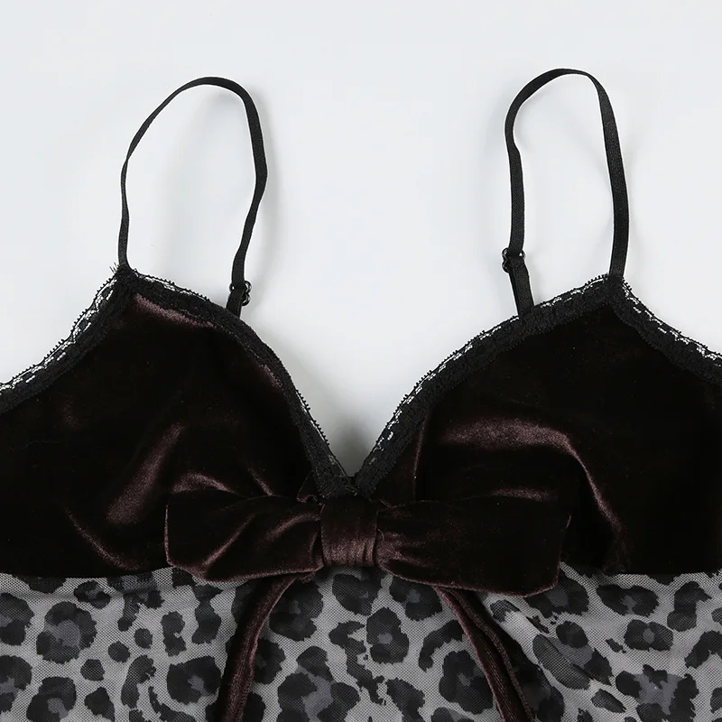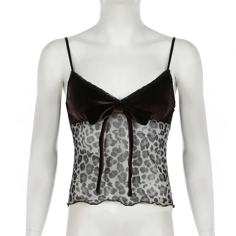 Leopard Mesh Crop Top y2k Bow Velvet Patchwork See Through Mini Vest Grunge Korean Vintage Camisole Lace Frill Tanks