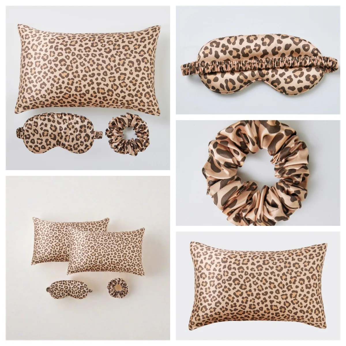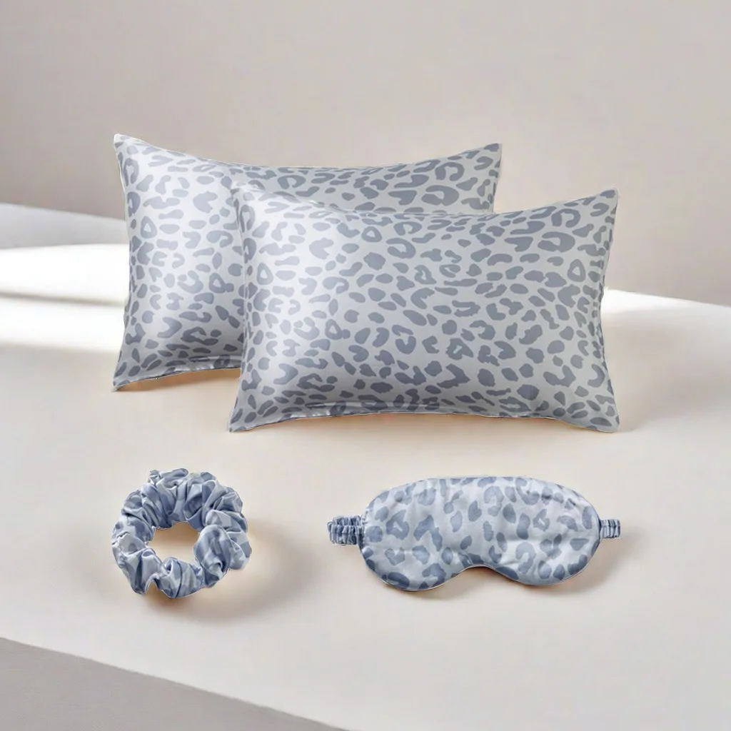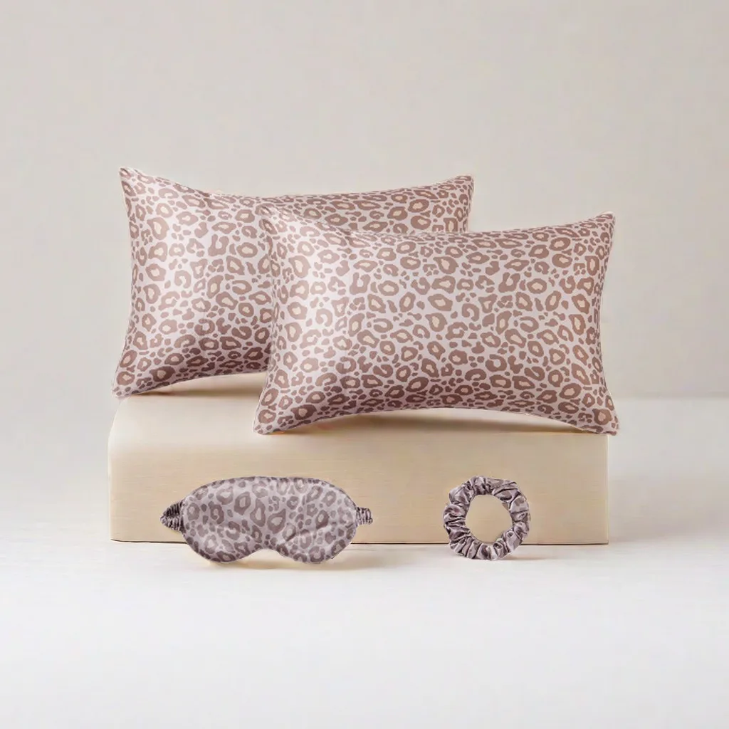 Leopard Print 4PCS Satin Sleep Set – 2 Pillowcases with Eye Mask and Hair Scrunchie for Nighttime Beauty Care and Travel Comfort