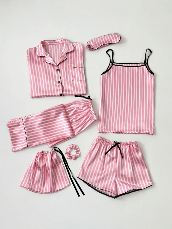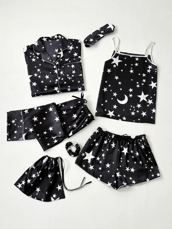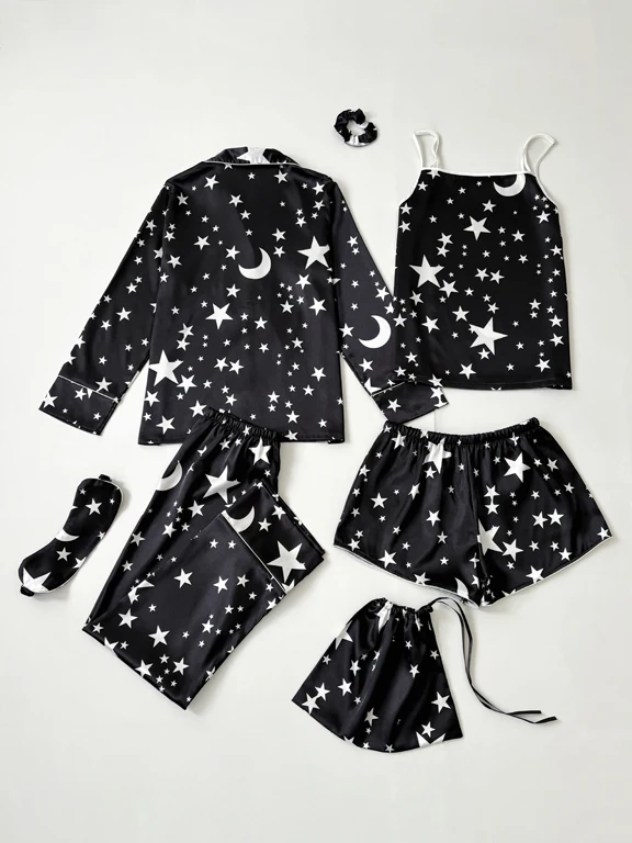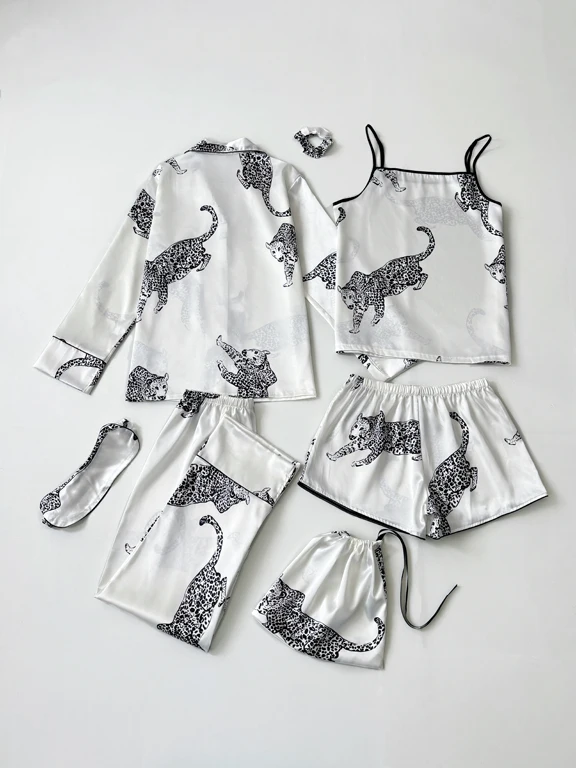 Luxurious women's starry sky print, leopard print satin pajama set, including pocket collar top, pants, shorts, adjustable shoul