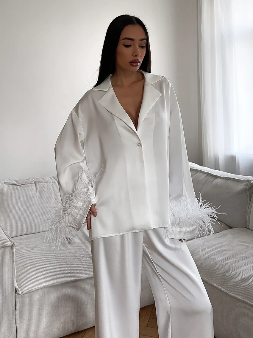 Marthaqiqi Feathers Female Nightgowns Suit Sexy Turn-Down Collar Sleepwear Long Sleeve Nightwear Pants Fashion Women Pajamas Set