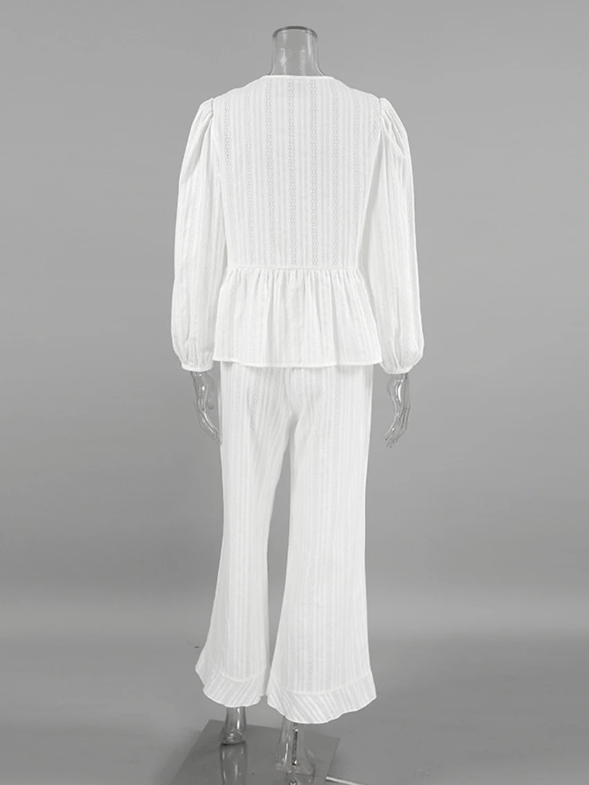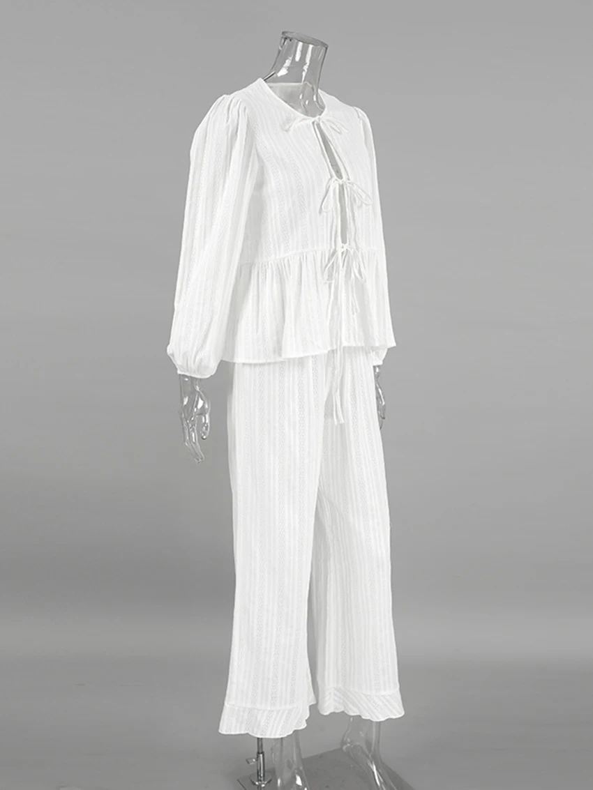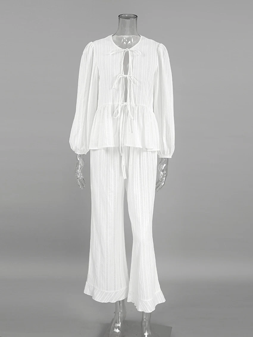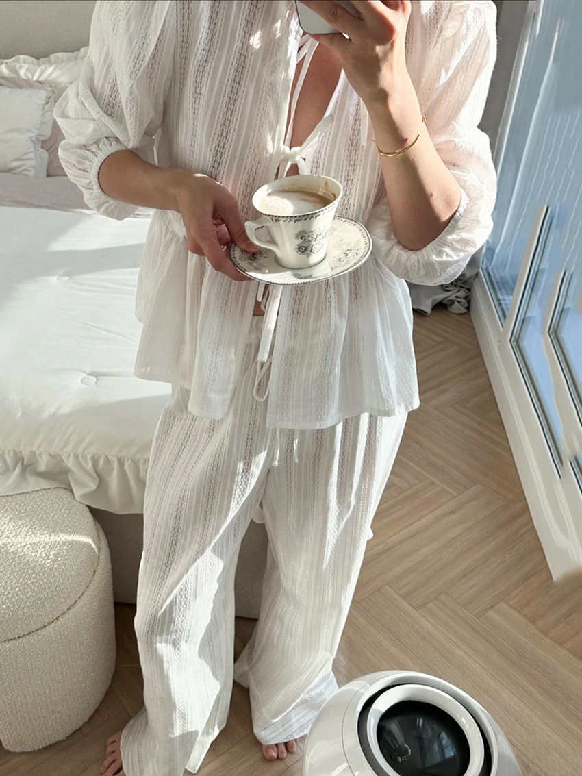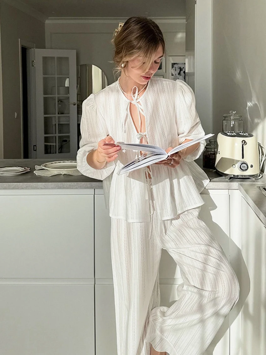 Marthaqiqi Winter Women Pajamas Suit Lace Up Sleepwear Long Sleeve Nightgowns O-Neck Nightwear Pants Casual Ladies Home Clothes