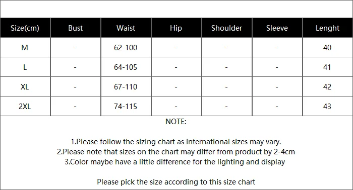 size_info: {"sizeInfoList":[{"length":{"cm":"62-100","inch":"24.41-39.37"},"size":"M","vid":-1},{"length":{"cm":"64-105","inch":"25.20-41.34"},"size":"L","vid":-2},{"length":{"cm":"67-110","inch":"26.38-43.31"},"size":"XL","vid":-3},{"length":{"cm":"74-115","inch":"29.13-45.28"},"size":"XXL","vid":-4}]}