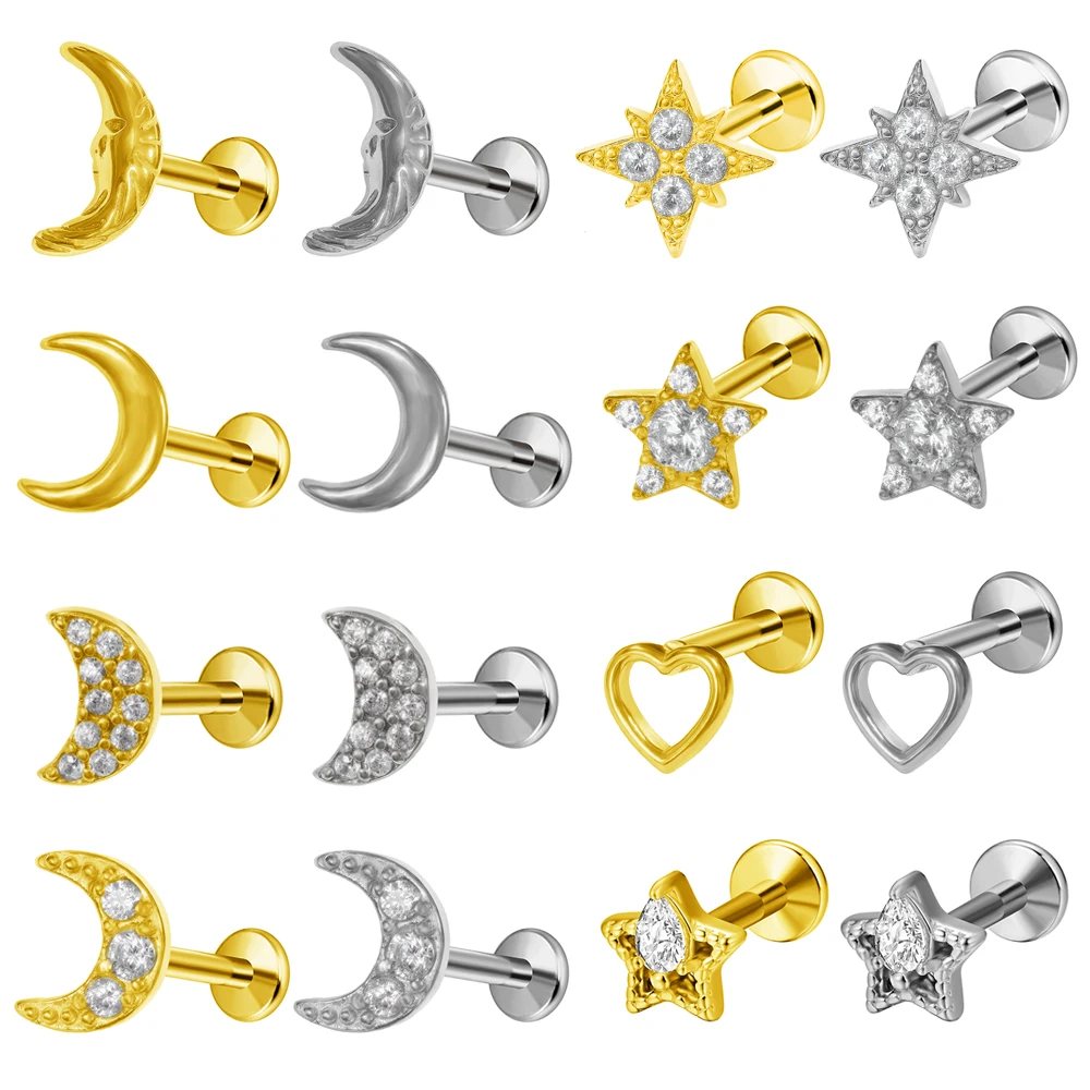 Moon Flat Back Earrings Star Labret Piercing Tragus Heart Internal Thread Cartilage Helix 100% 316L Stainless steel Body Jewelry
