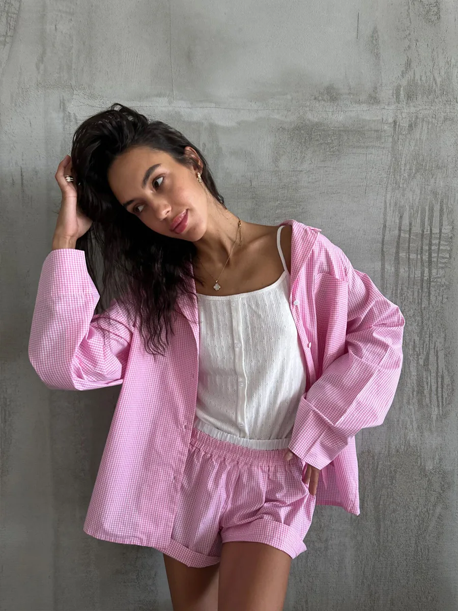 Muzuleva 100% Cotton Pink Patchwork Checkered Pajama Set Spring New Long Sleeved Shorts Pajamas Women's Casual Home Clothes