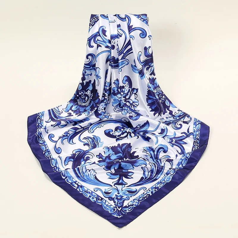New Blue And White Porcelain Satin Silk Square Scarf Hijab Printed Muslim Women Headscarf Ladies 2024 Headband Scarf 90*90cm