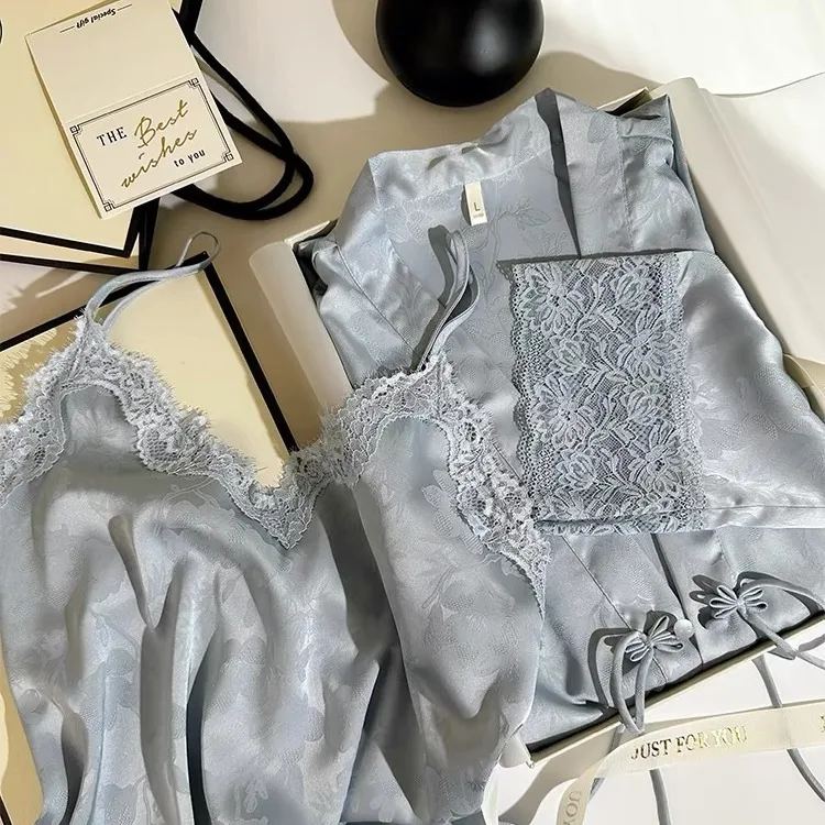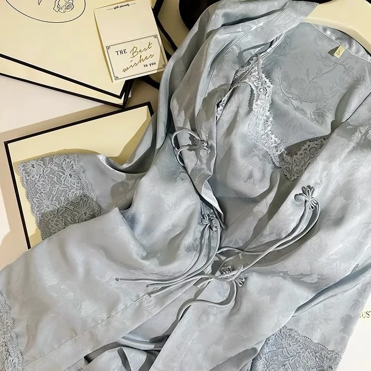 New Chinese Style 2PCS Robe Nightgown Set Sleepwear Sexy Lace Suspender Nightdress Loungewear Jacquard Satin Bathrobe Homewear