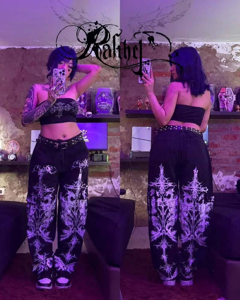 New Hip-hop Punk Harajuku Y2K Streetwear Trousers Women Goth Cross Print Baggy Jeans American Retro High Waist Wide-leg Pants